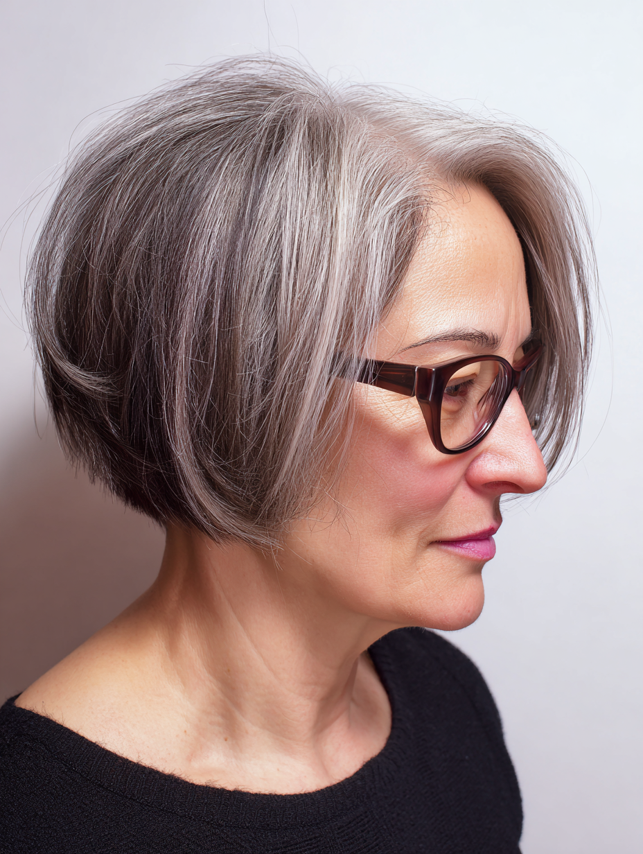 A short angled bob pairs beautifully with glasses by creating structure around the jawline. The angled shape draws attention downward, balancing frames at eye level.