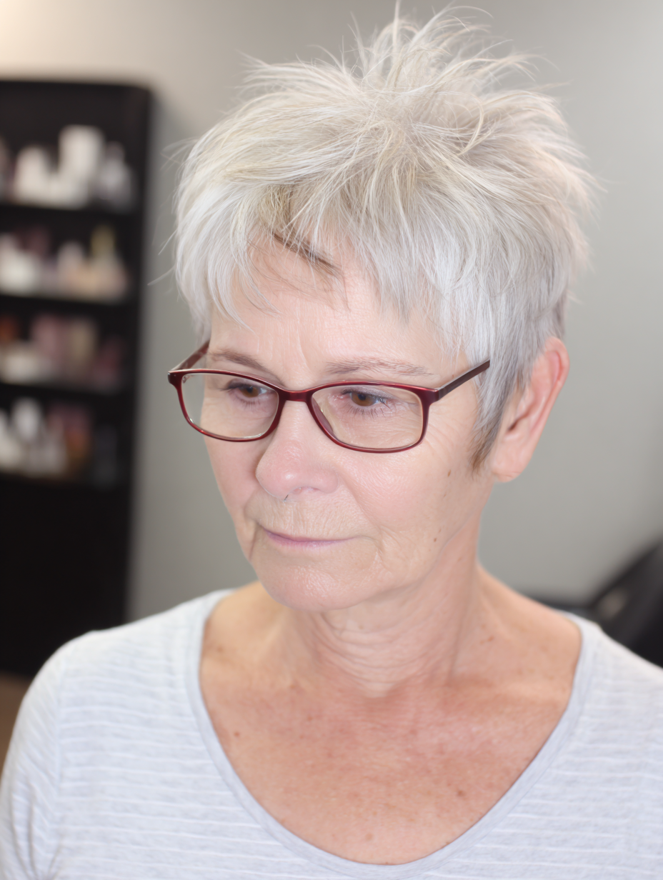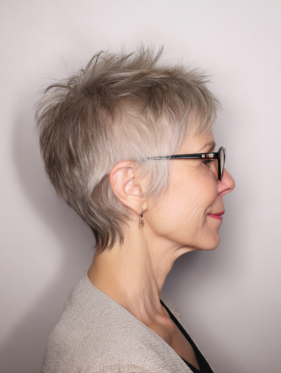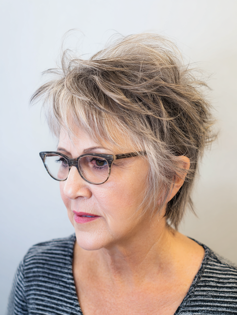 A tousled pixie with soft definition works well with glasses by keeping the look relaxed and open.