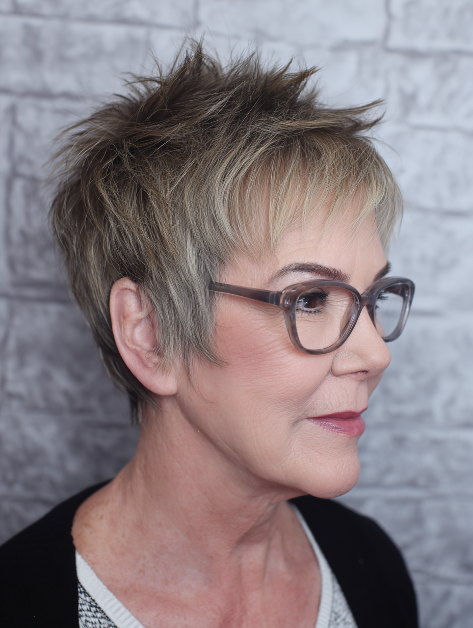 A choppy pixie with a lifted crown works well with glasses by adding height and openness.