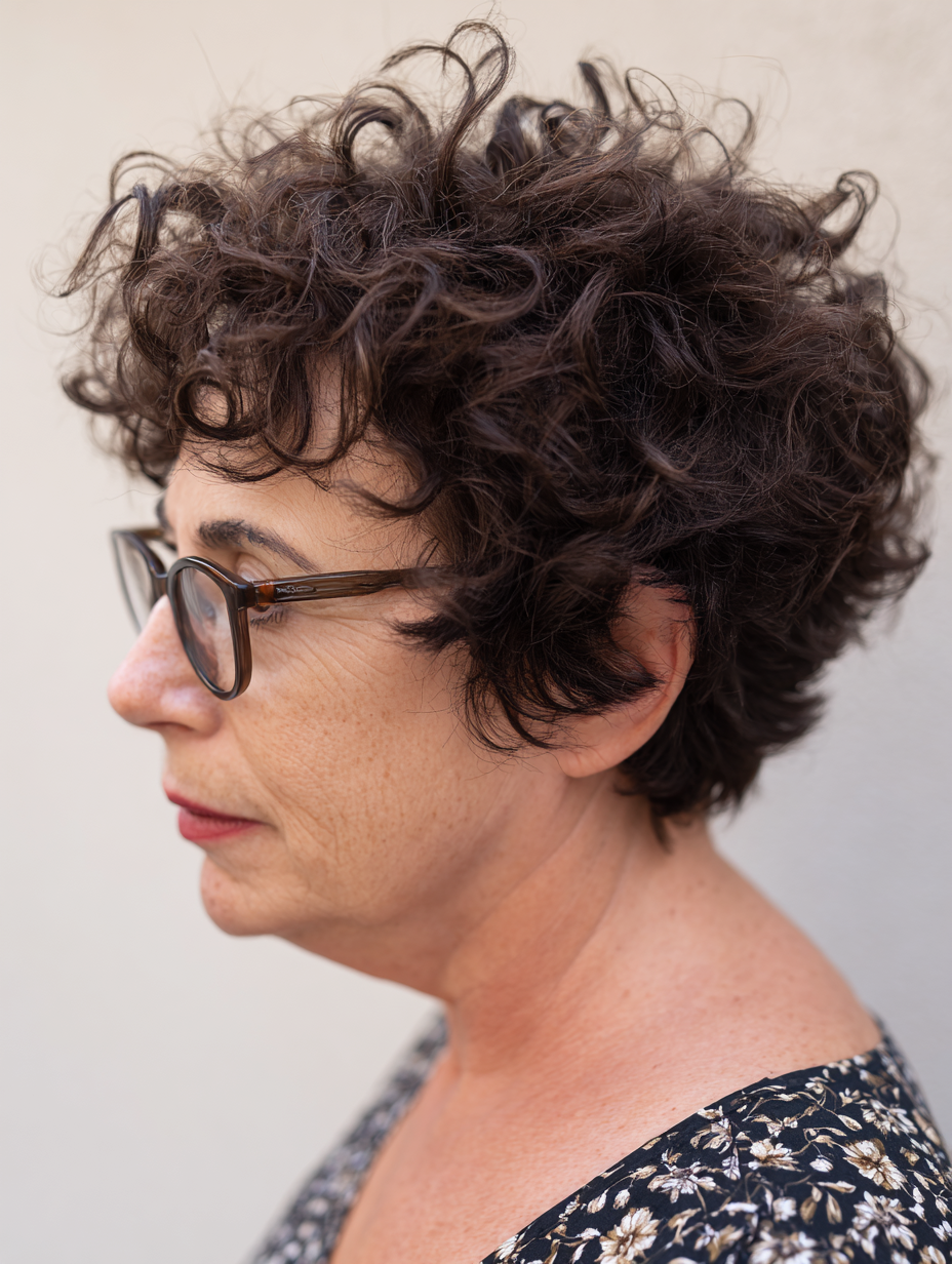 Defined curls add softness around the face, balancing structured frames. The short length prevents curls from tangling with glasses arms, improving comfort.