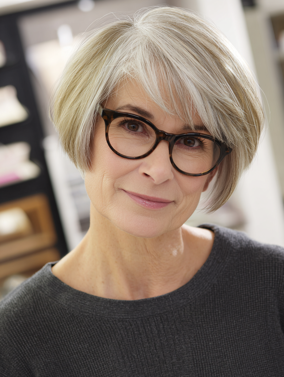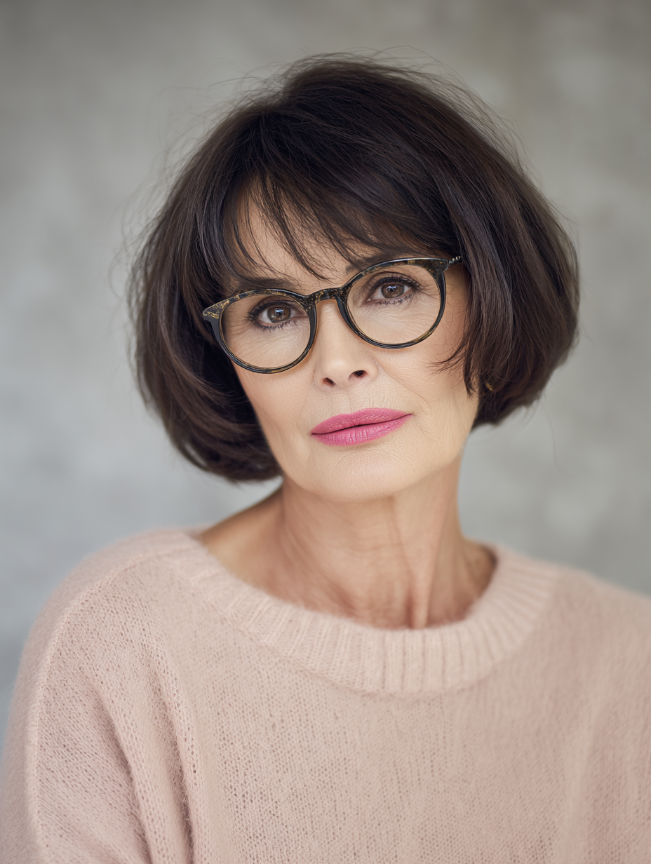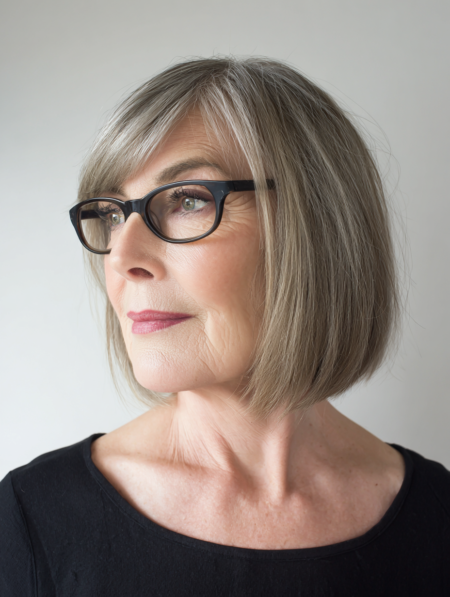 A short blunt bob with softened ends pairs nicely with glasses by offering structure without harshness.