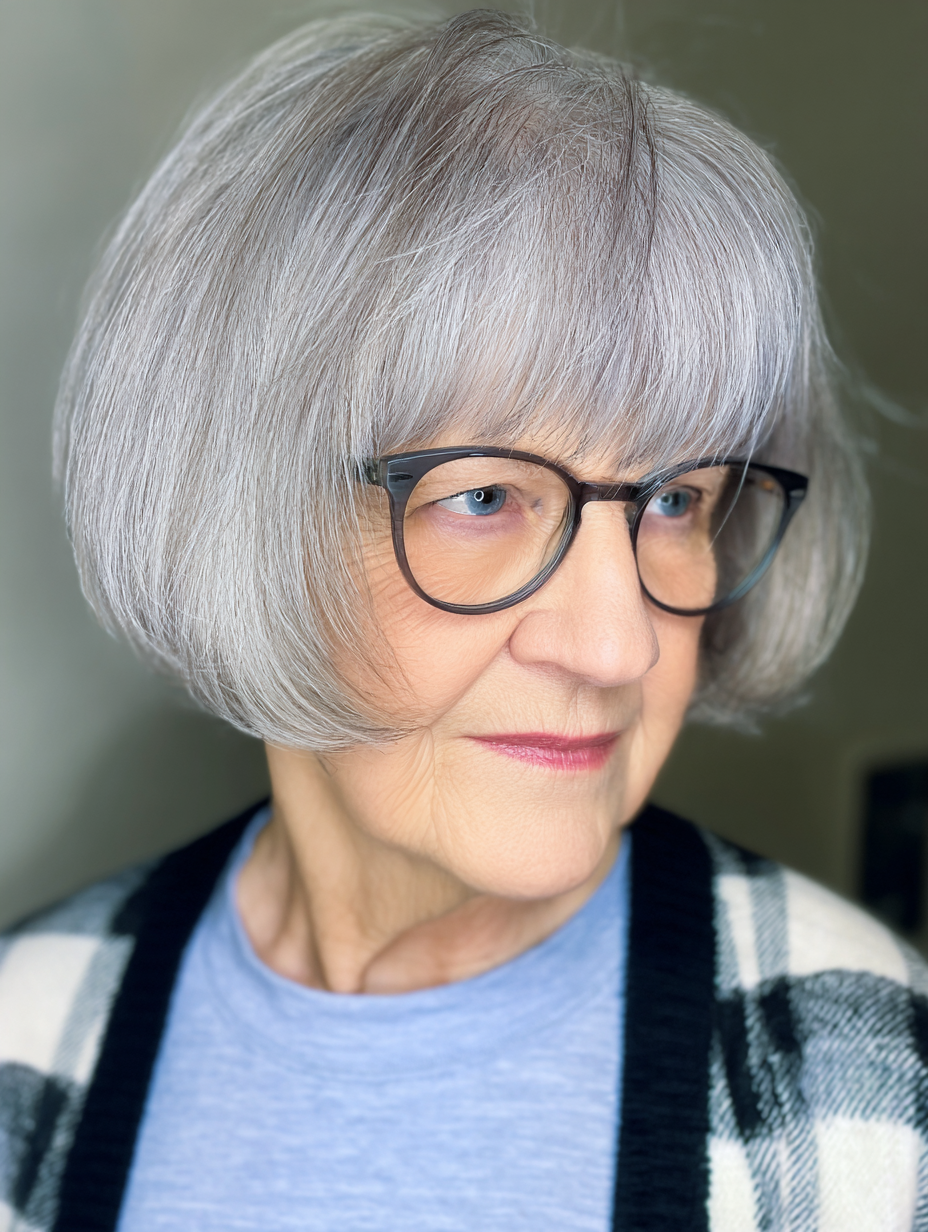 The bangs soften the forehead and blend seamlessly with frames. Keeping the bob short prevents bulk near the temples. This style works well for medium to fine hair textures.