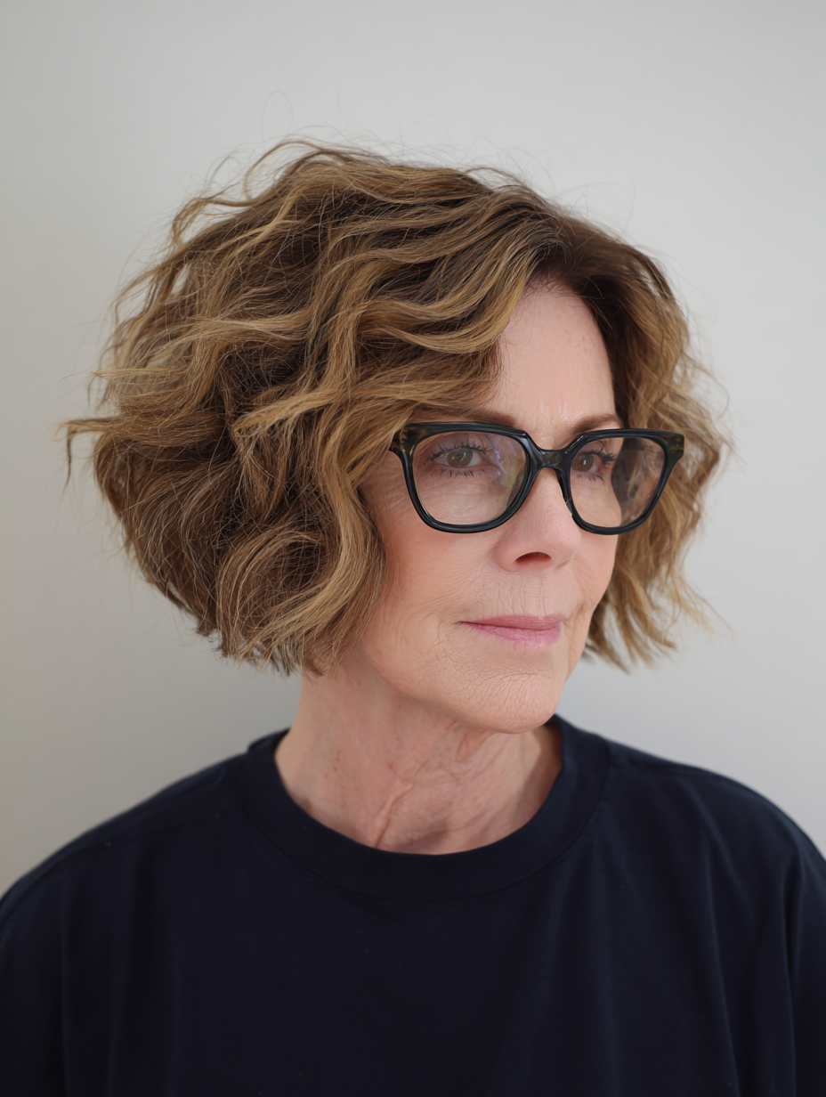A short wavy bob complements glasses by adding movement and softness around the face.
