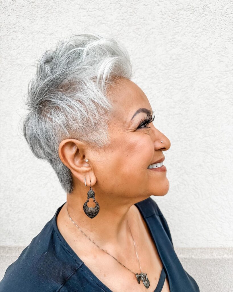This hairstyle is an excellent choice for women over 50 ready to embrace bold, artistic styling with ease. It’s fashion-forward, flattering, and effortlessly cool—perfect for showcasing natural silver tones with confidence.