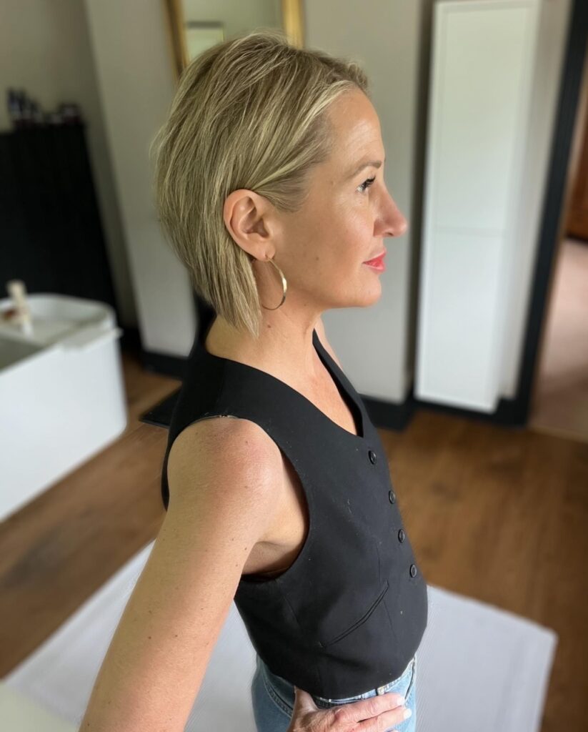 A fantastic option for bold women in midlife, this haircut is edgy yet elegant, ideal for showcasing confidence, individuality, and effortless style.