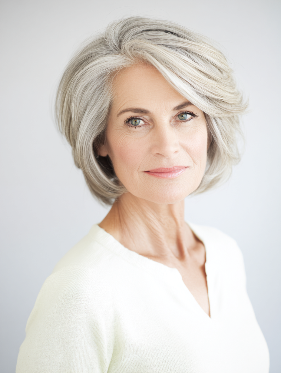 Short layered bob styles offer balance between structure and movement for mature hair.