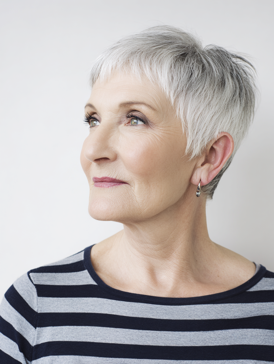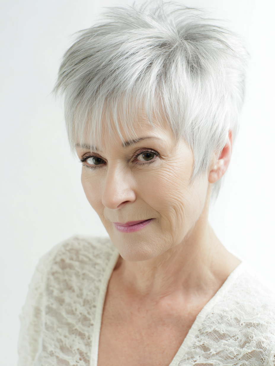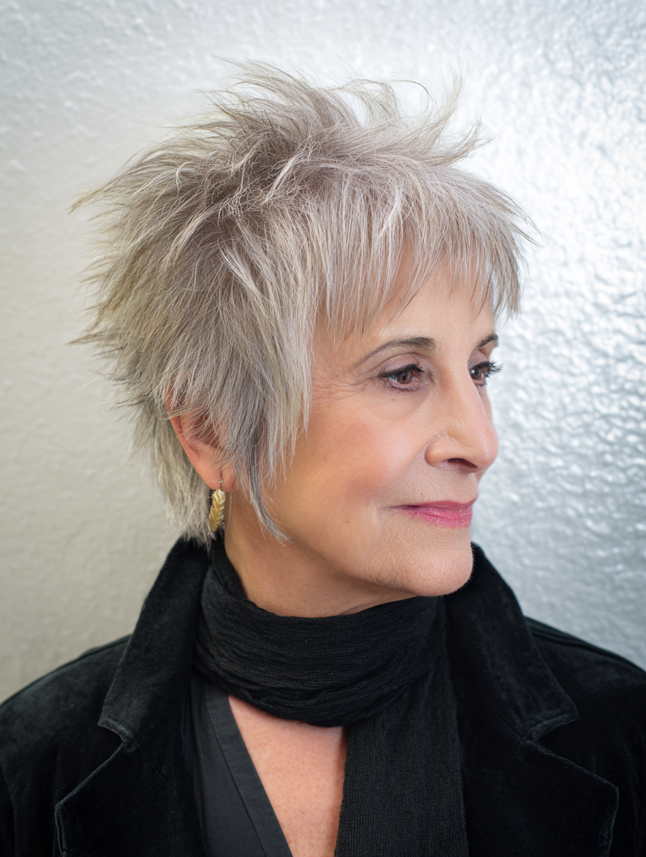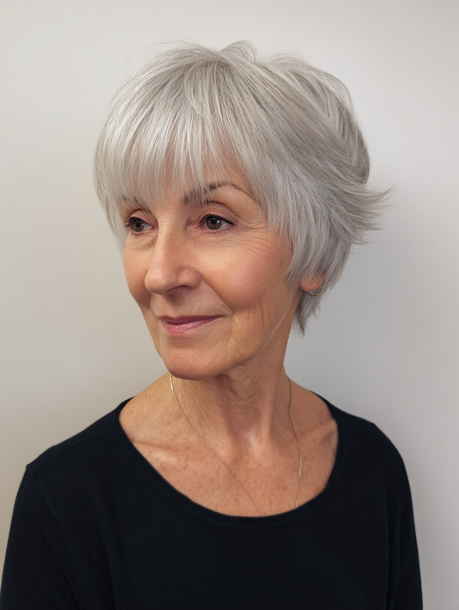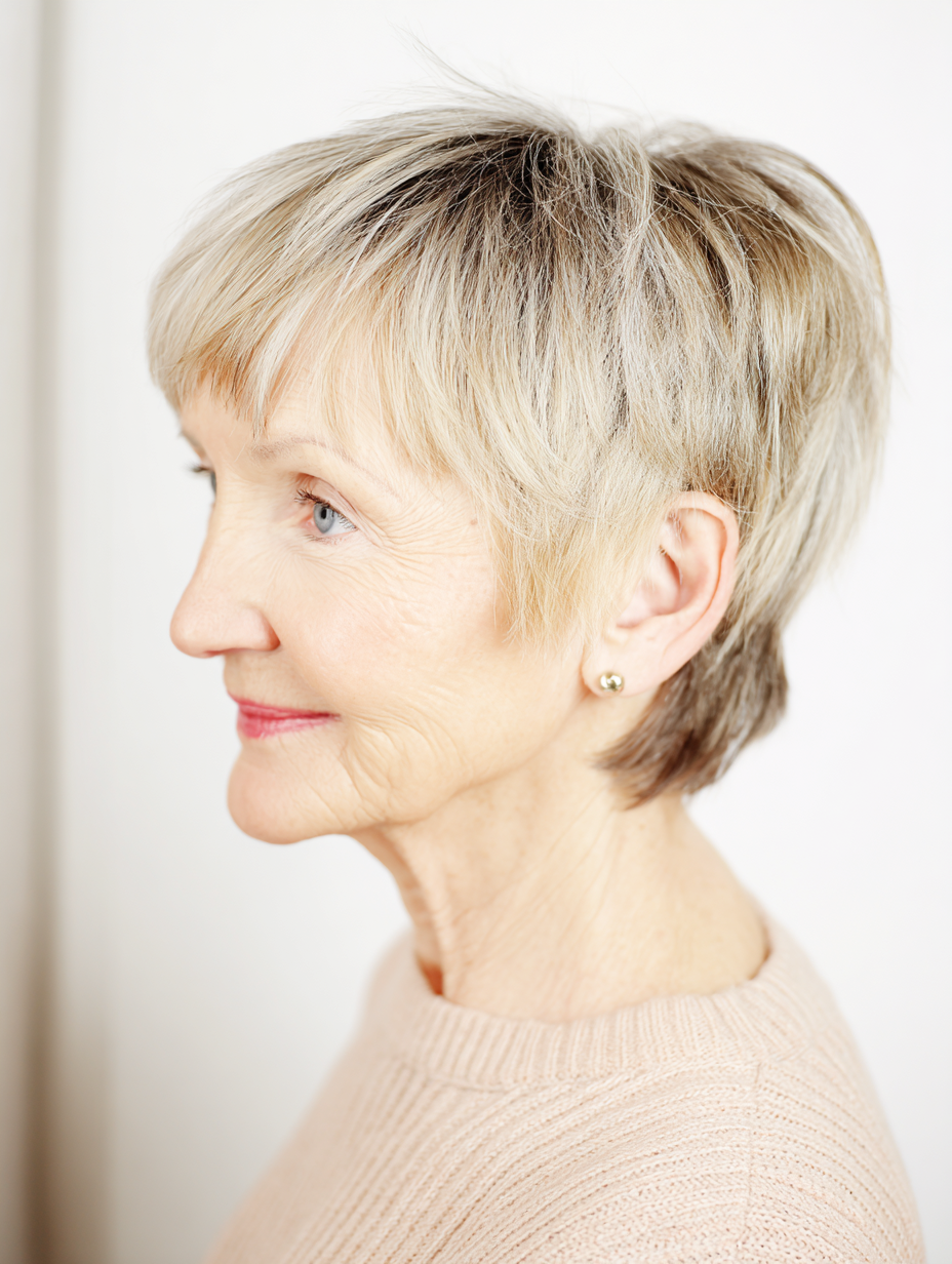 The uneven ends add volume where hair often thins after sixty. This cut flatters round and square faces by breaking up heavy lines. Use a light mousse and finger style for texture.