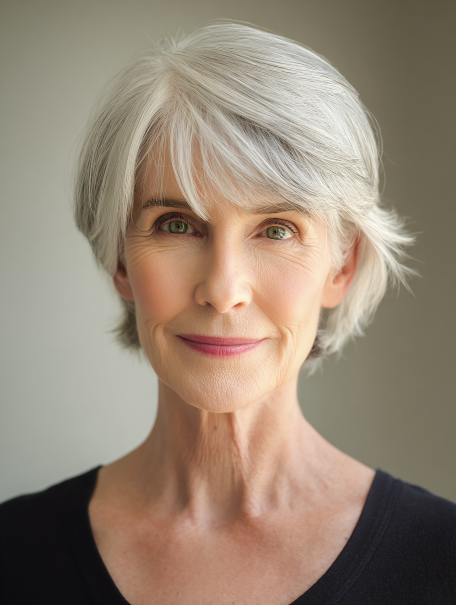 The longer front pieces flatter aging features without feeling heavy. Styling stays simple with a blow dryer and light volumizing spray.