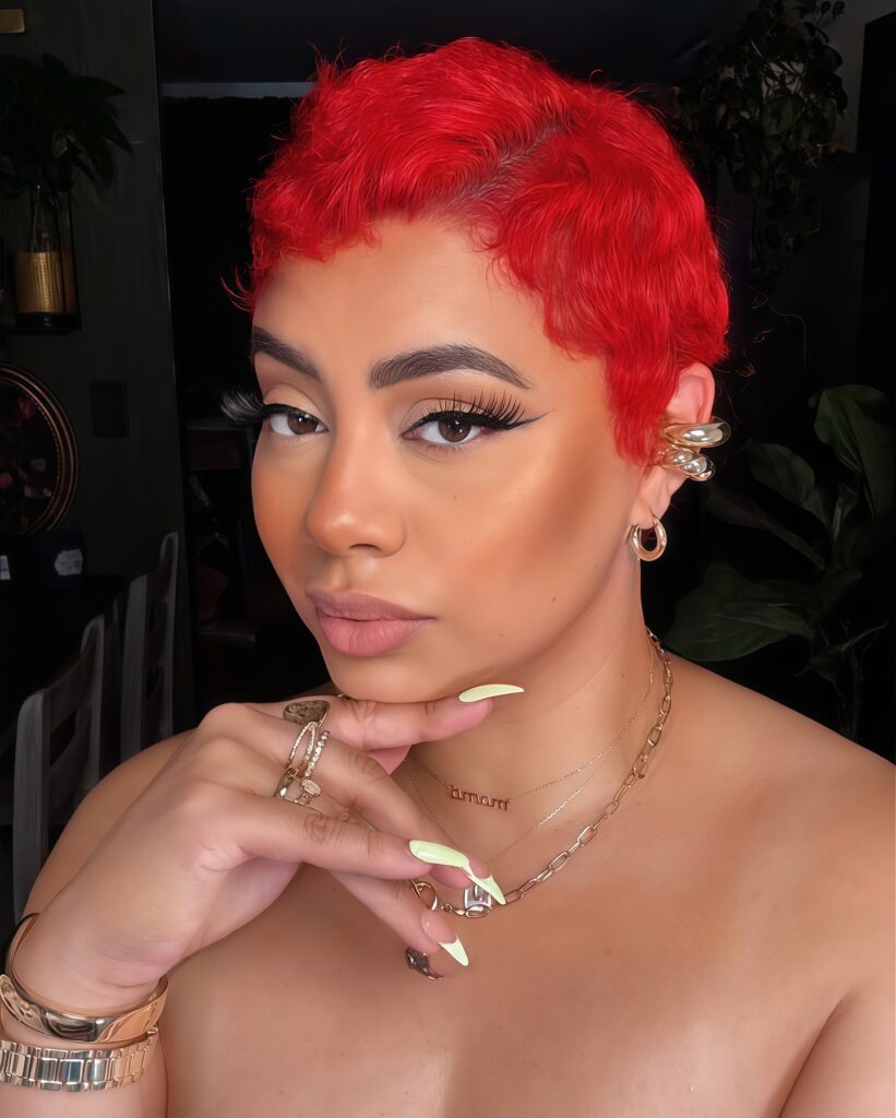 This fiery red pixie cut commands attention with its bright color and soft, curly texture. The close-cropped style hugs the head, while the natural waves on top add movement and dimension.