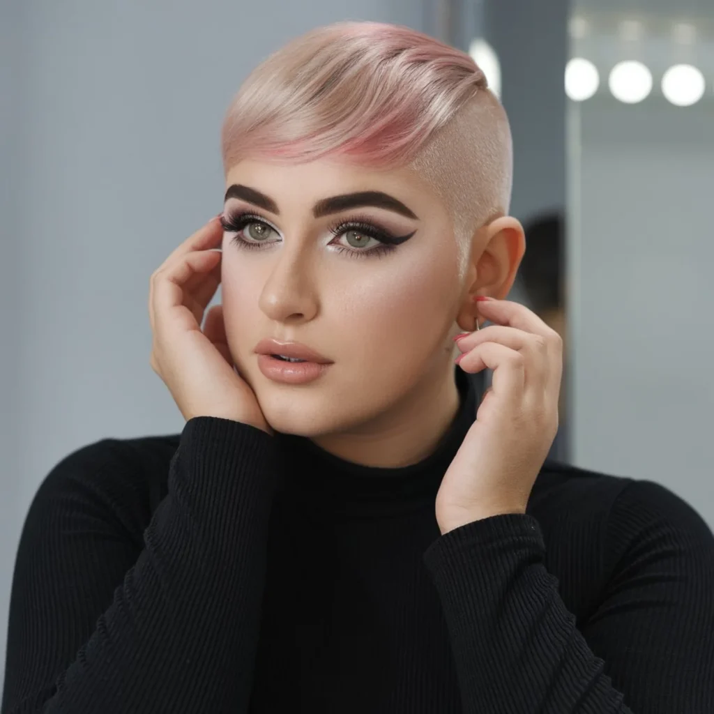 This bold pixie cut features a dramatic undercut that contrasts sharply with a longer, side-swept top. The top section is dyed a soft platinum blonde with hints of pastel pink, adding playful color without overwhelming the look.