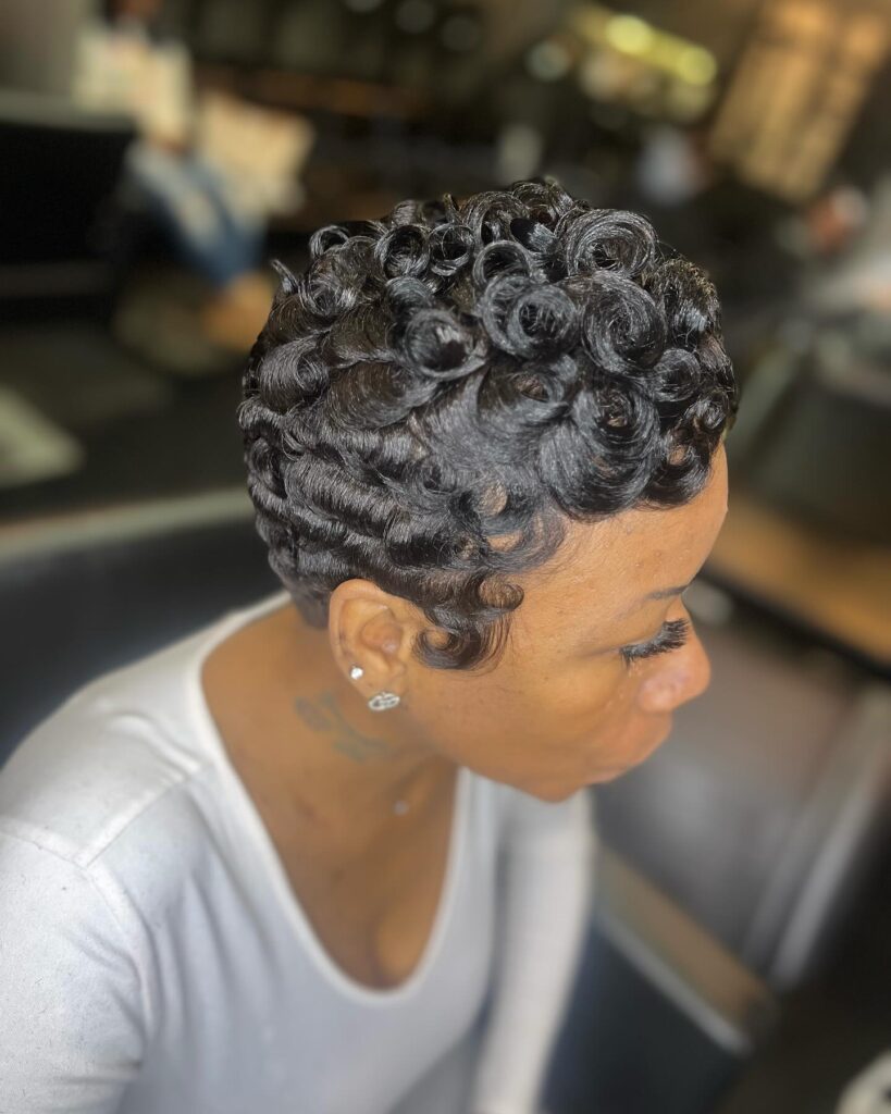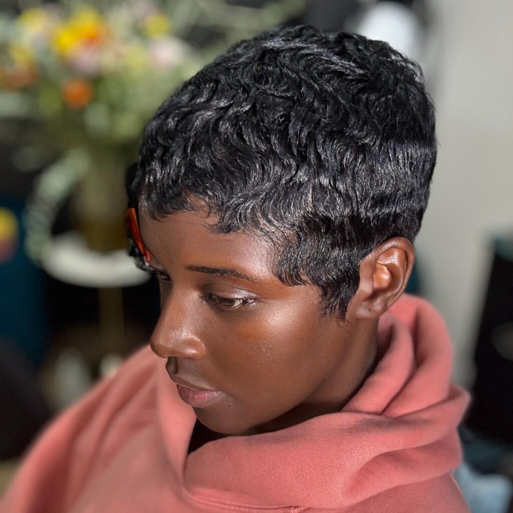 This stunning pixie cut showcases sculpted finger waves that create a smooth, wavy pattern across the head. The short, close-to-the-scalp length emphasizes the hair’s texture and sheen, giving the style a polished, vintage-inspired look.