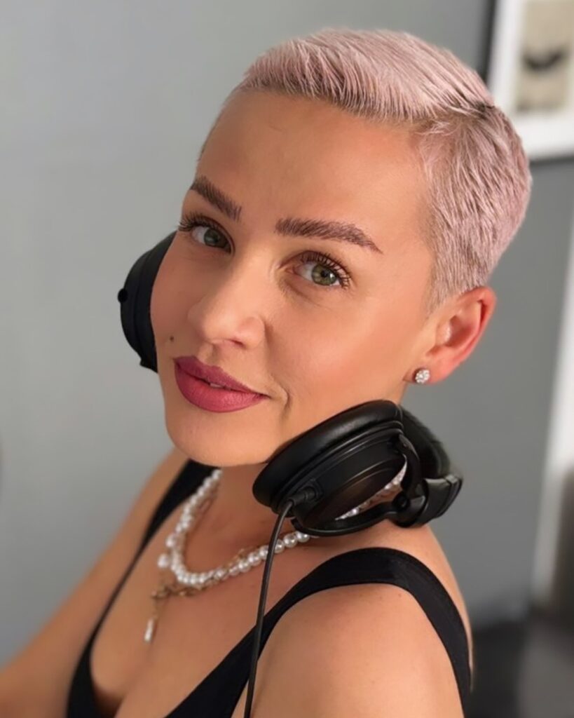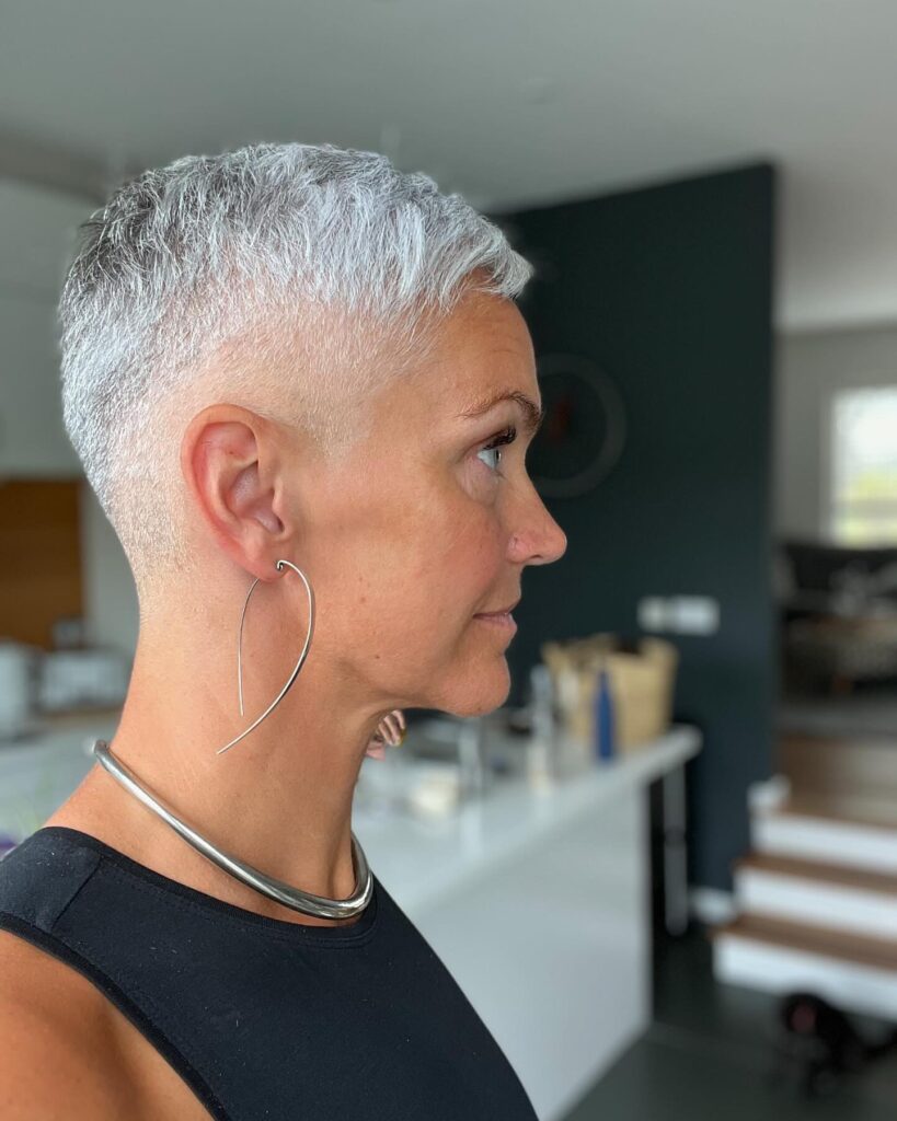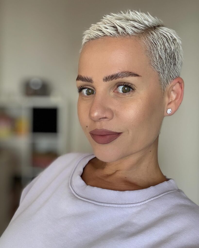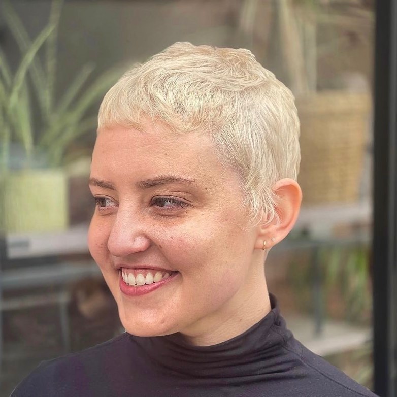 This ultra-short pixie cut is buzzed close to the scalp, creating a sleek and minimalist shape. The icy blonde color adds bold contrast and highlights the textured finish across the crown.