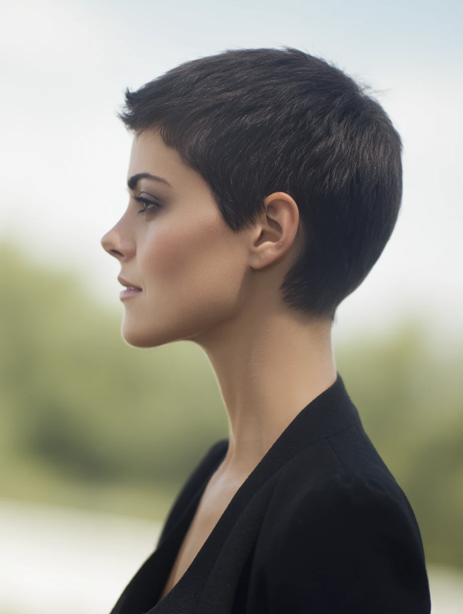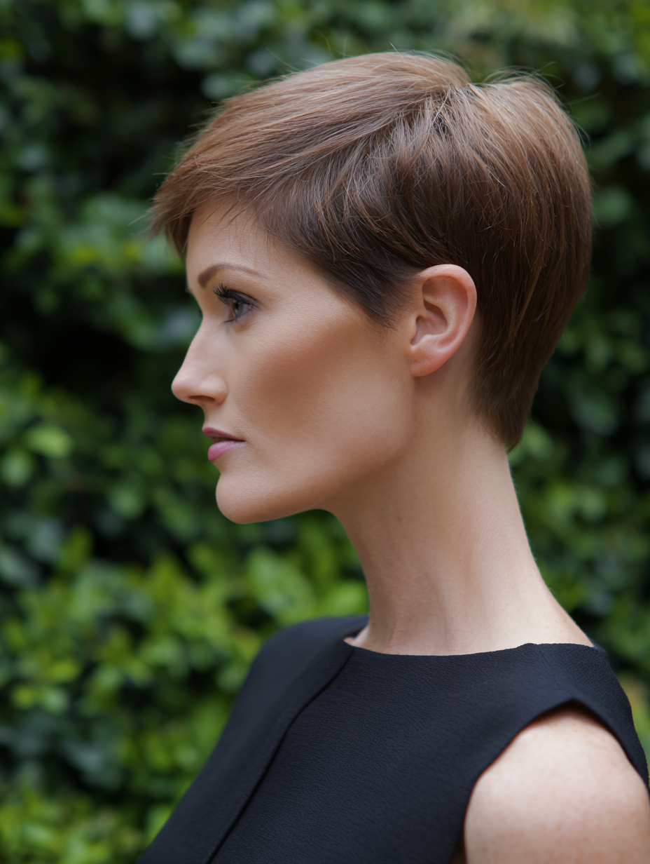This pixie feels refined, manageable, and flattering for women who prefer a polished silhouette.