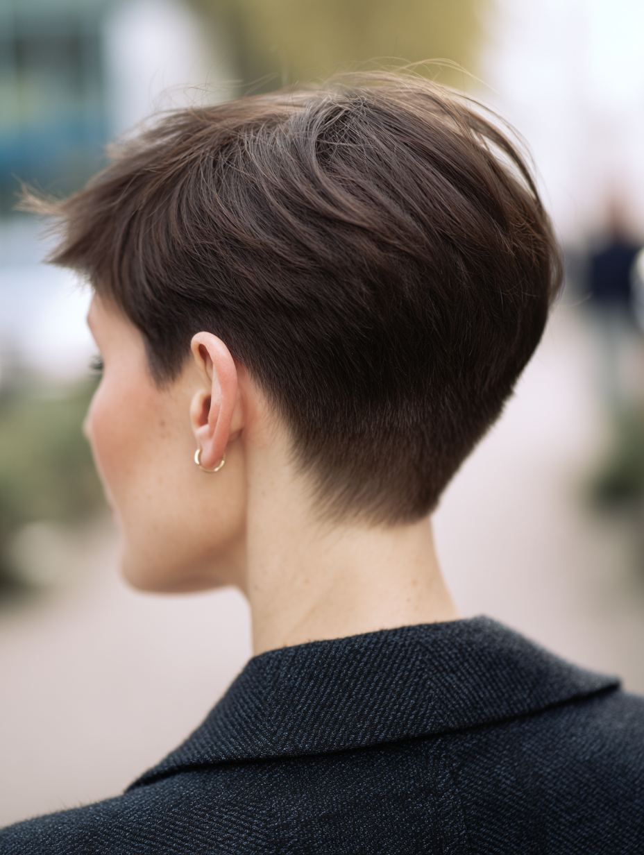 Tapered pixie cuts focus on clean edges while building subtle volume through the crown area.