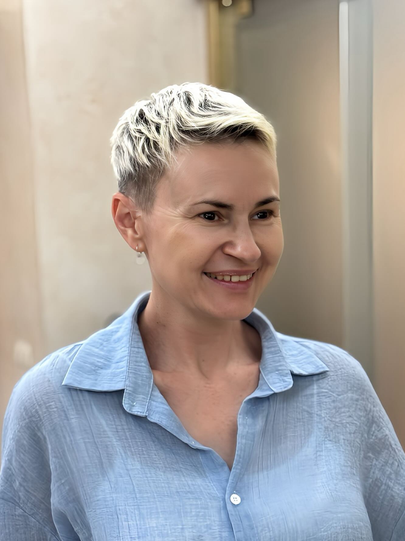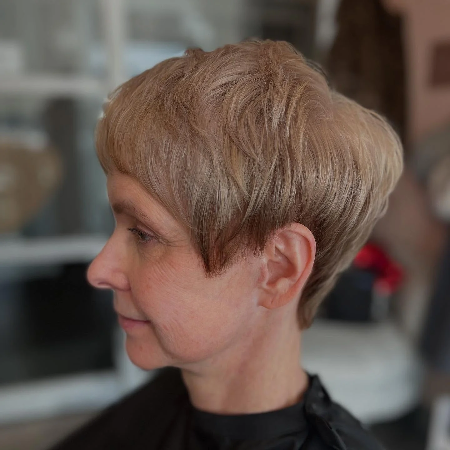It’s a confident, low-maintenance cut that works for anyone who wants a modern pixie with personality and easy everyday styling.