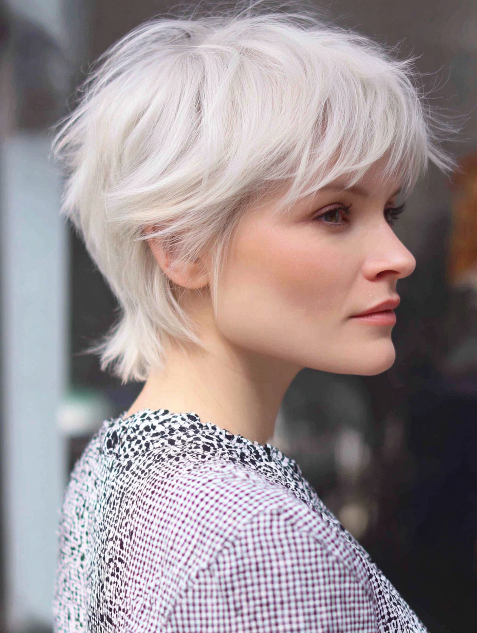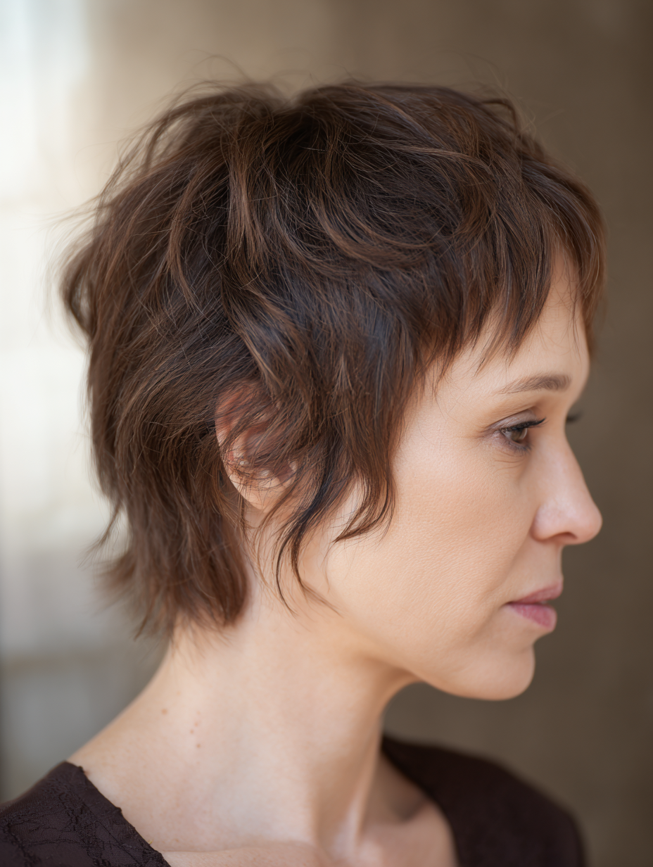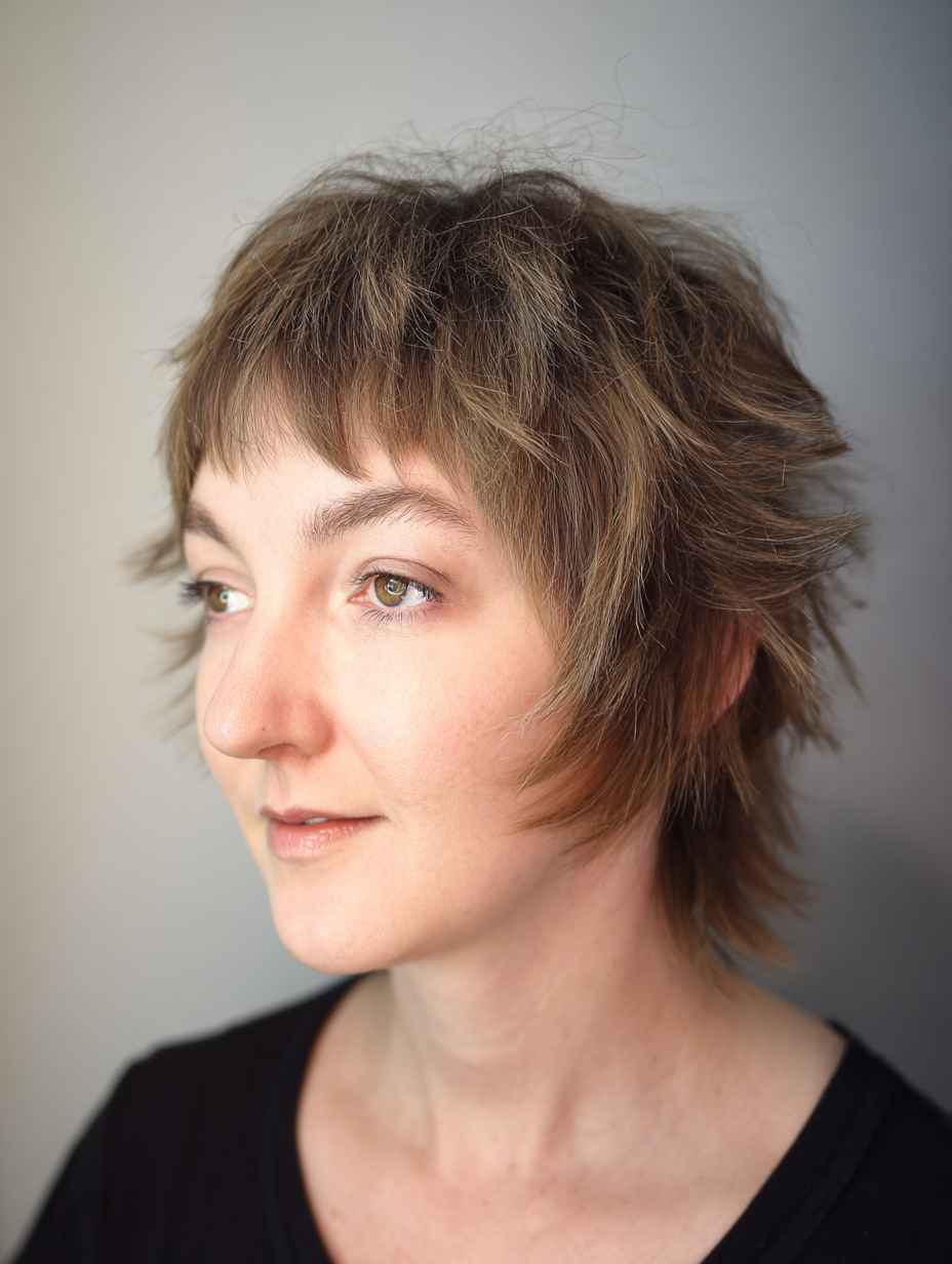 A soft fringe short shag gives fine hair a fuller, more balanced look without harsh lines.