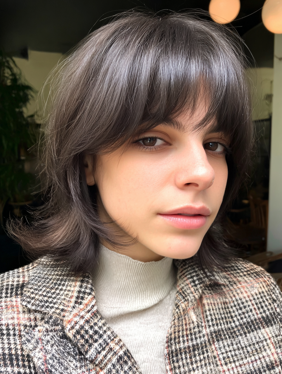 Shorter fringe draws attention upward, making hair look fuller at the roots. The layered sides keep movement flowing, avoiding a boxy shape.