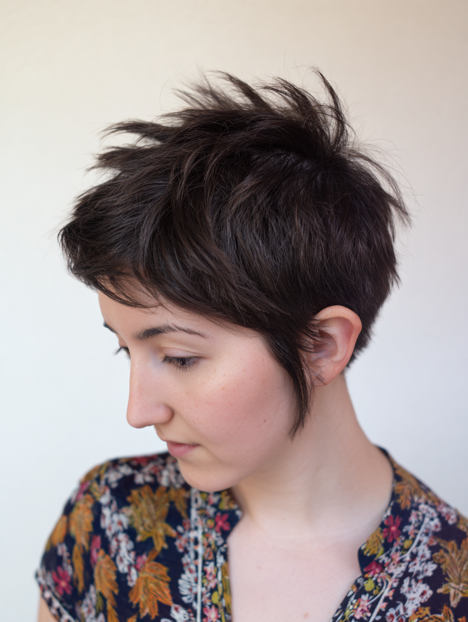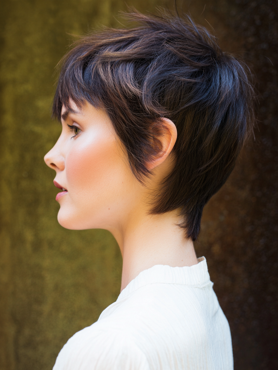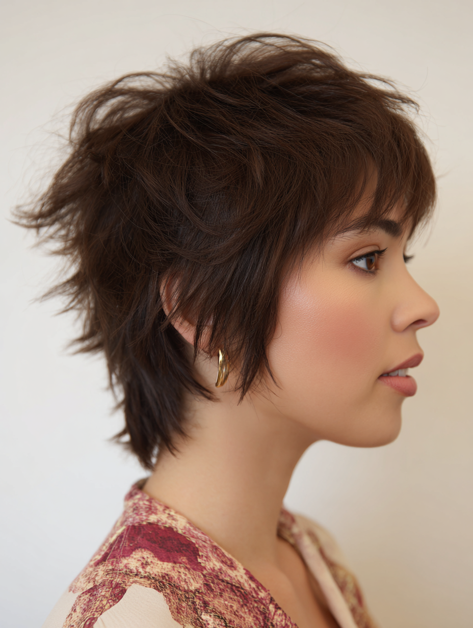 This layered pixie shag combines short length with textured layers for fine hair.