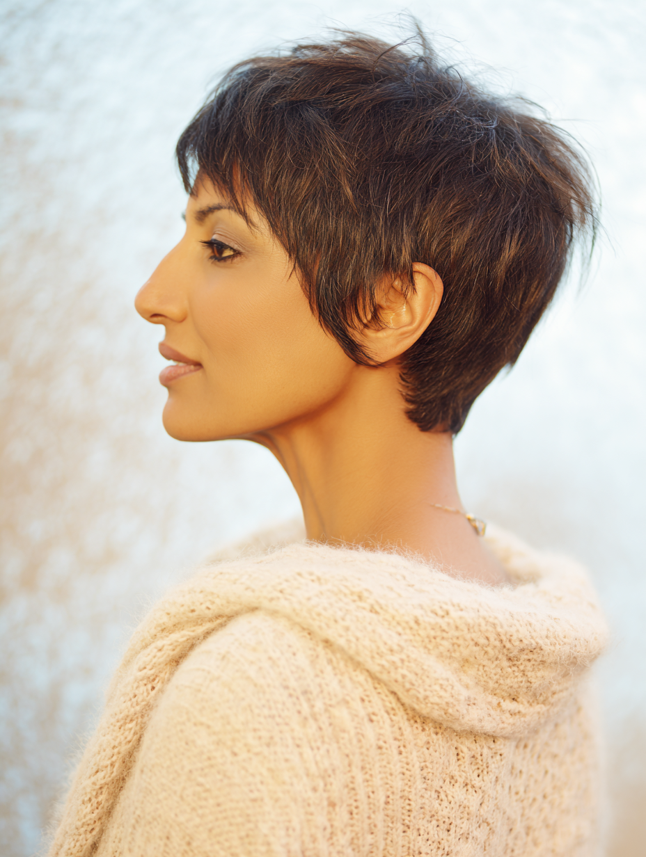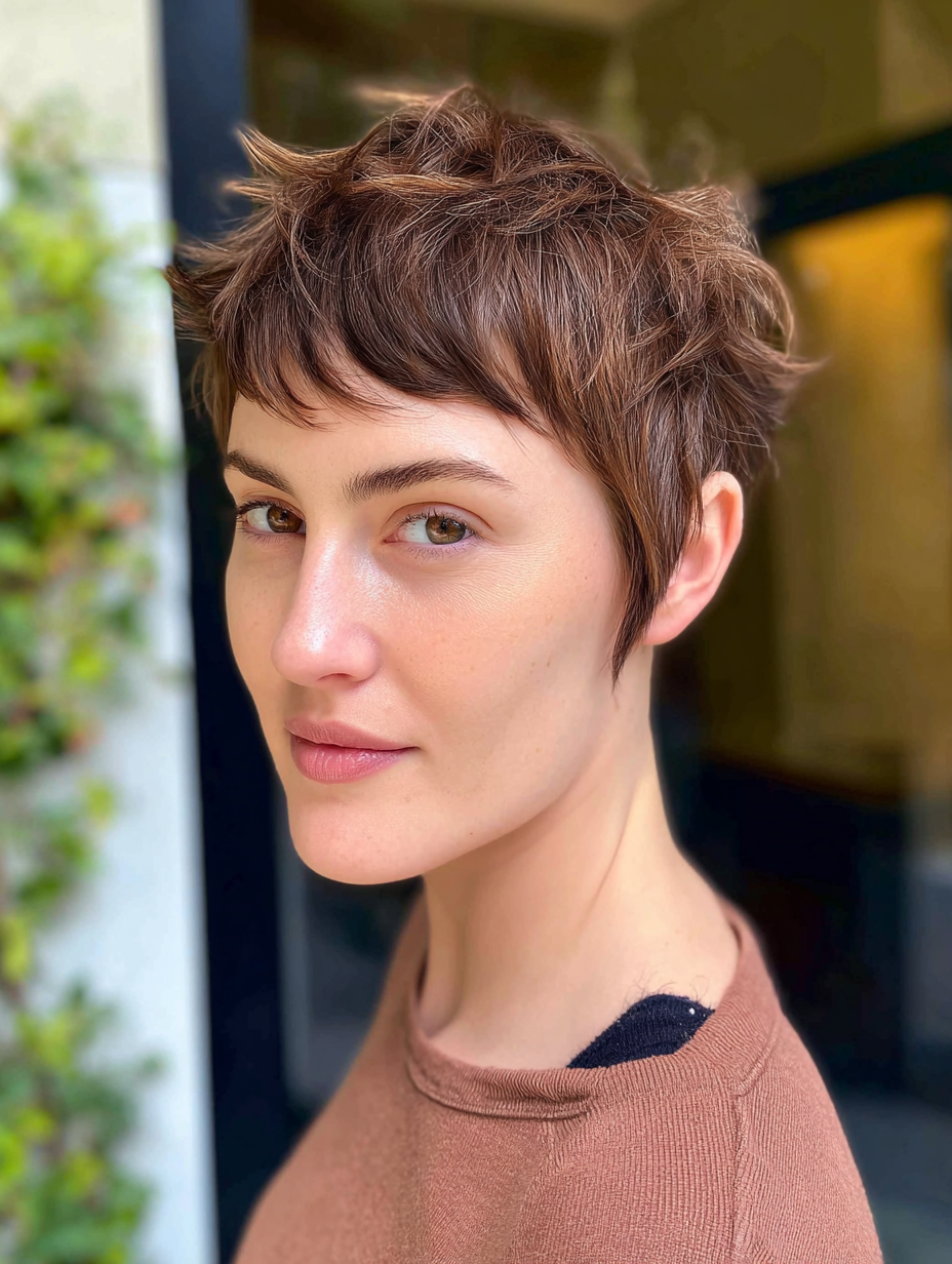 The cut highlights facial features and works well for petite frames. Despite the short length, it still feels playful and textured.