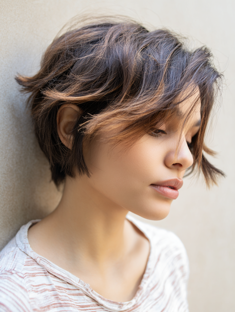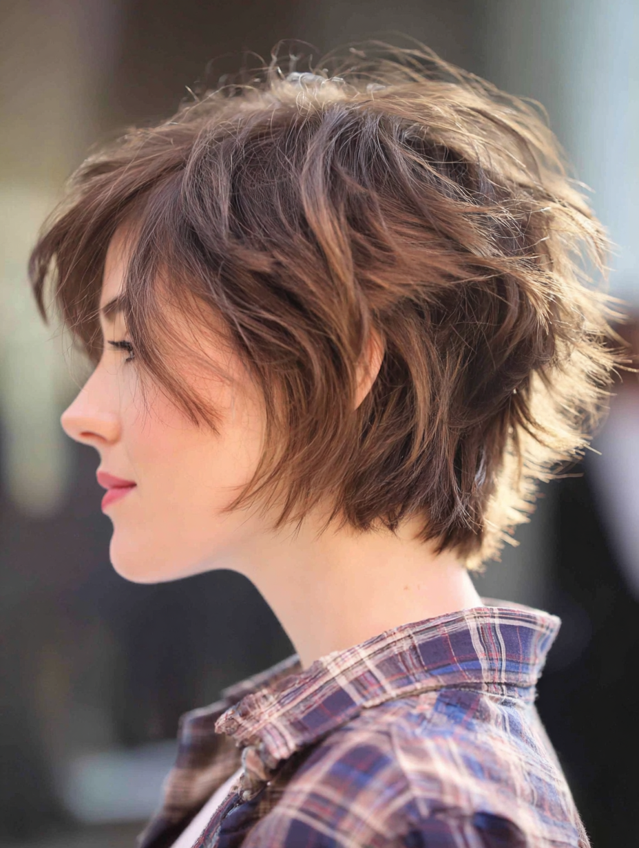 A tousled short shag with soft waves gives fine hair a thicker appearance instantly.