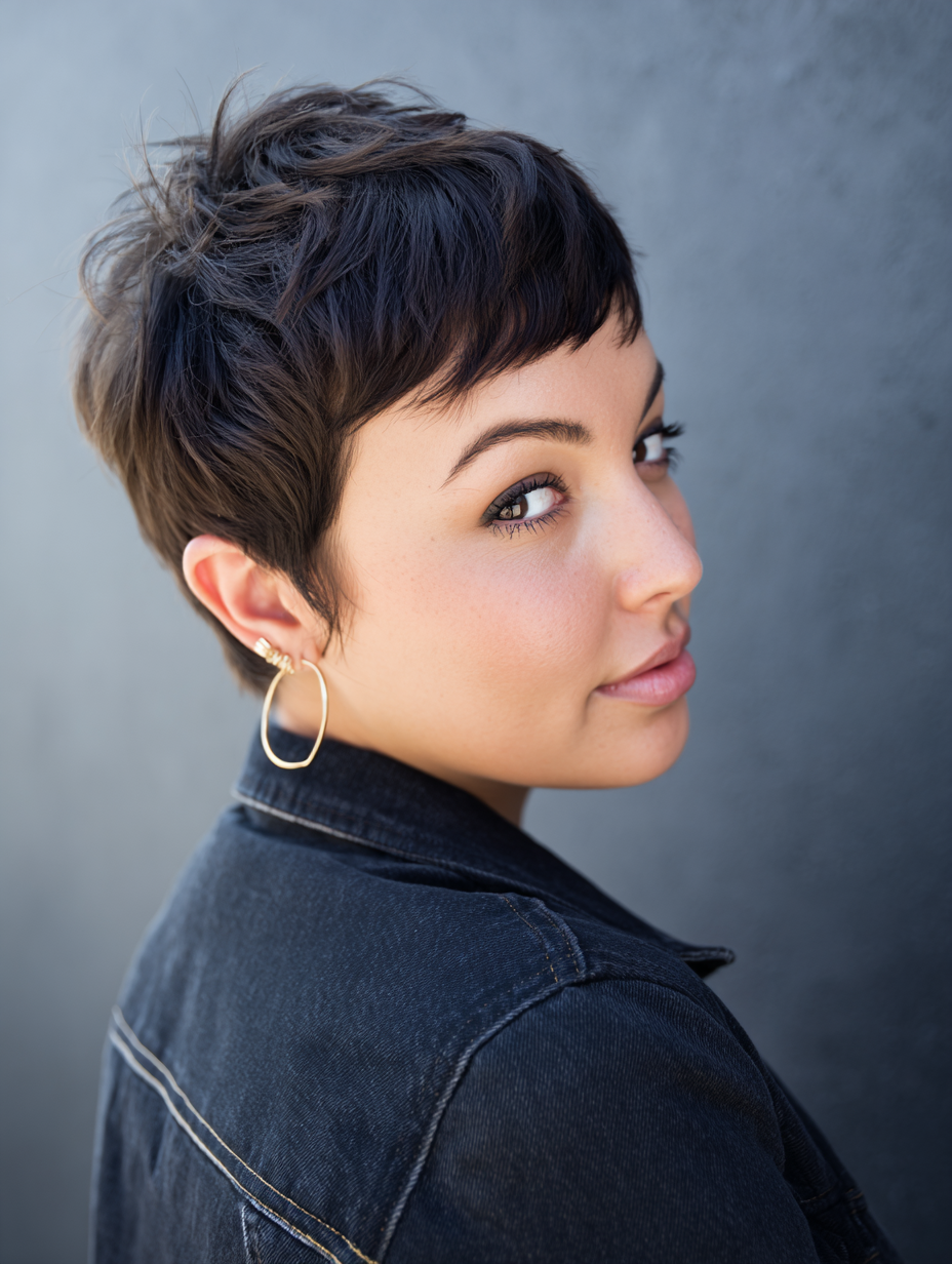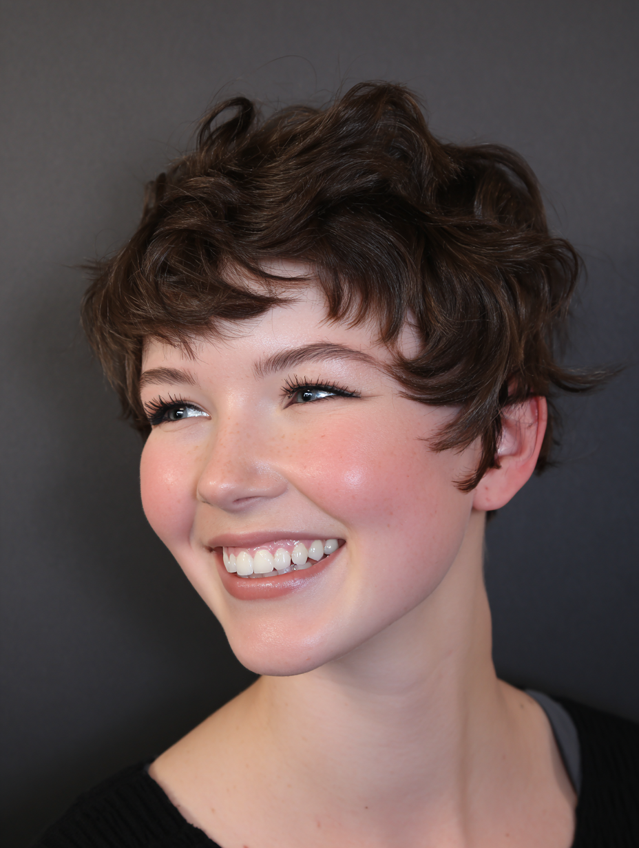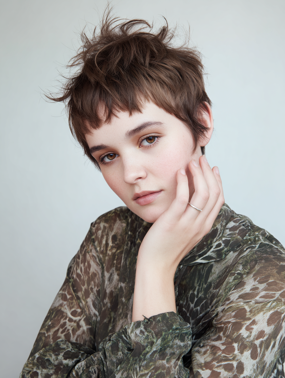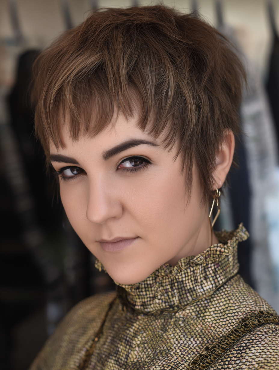 This pixie suits someone wanting fullness without weight, especially around the crown. It feels breezy and youthful, with movement that continues throughout the day.