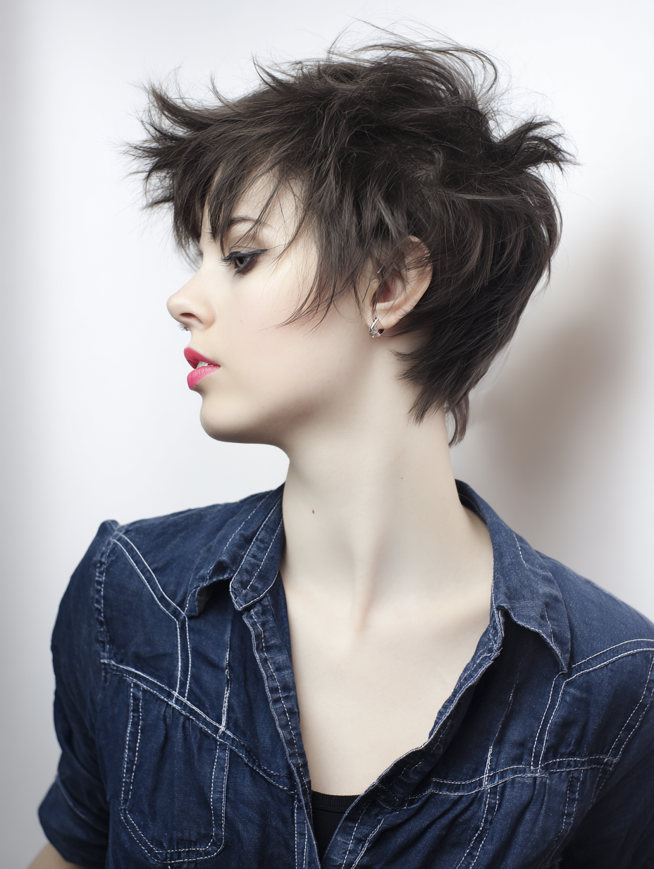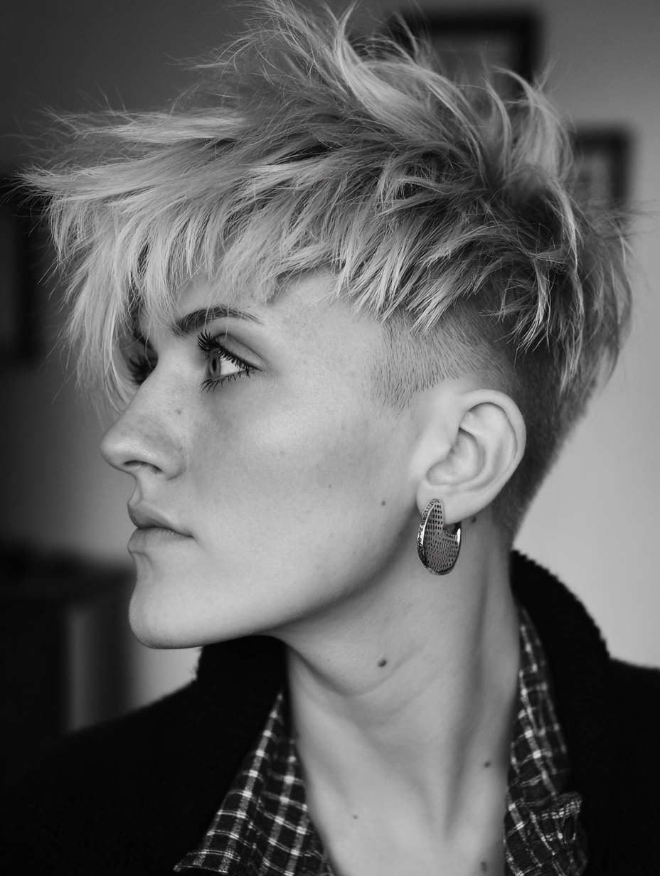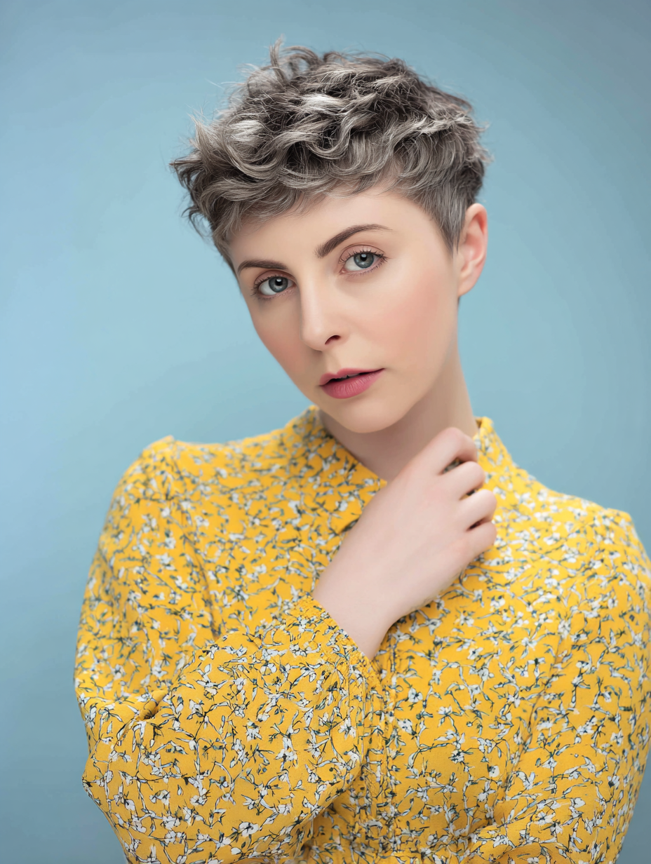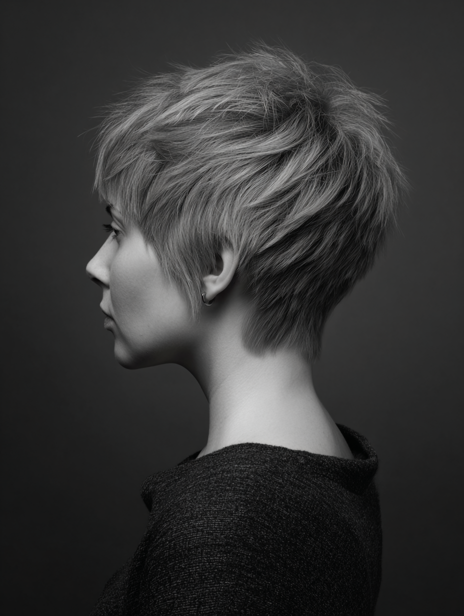 Shorter sides offer balance, letting the volume stay concentrated on top. It suits those who want a low-maintenance pixie that still feels intentional.