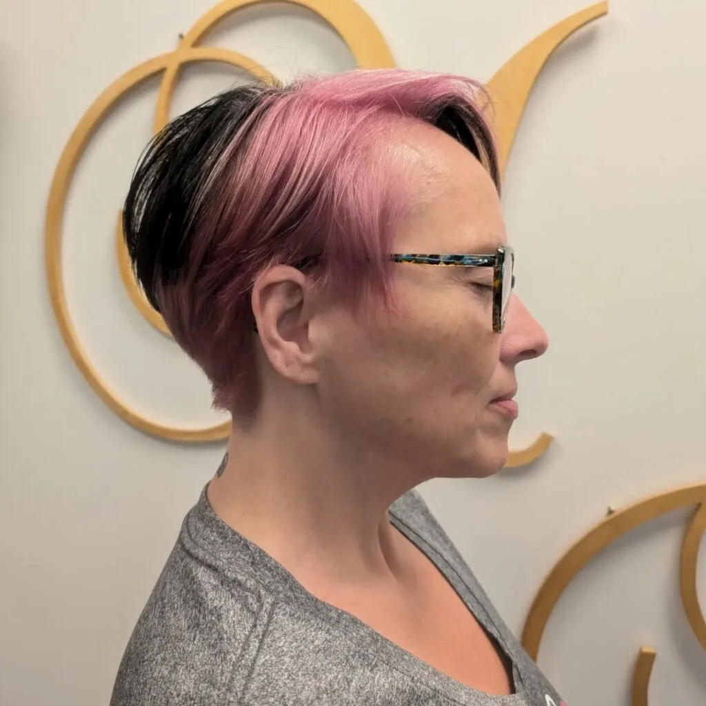 A vibrant pink top section contrasts dramatically with the dark black underlayer, enhancing the visual impact. The long fringe sweeps across the forehead, softening the edgy vibe. Ideal for anyone wanting a modern cut with personality and flair.