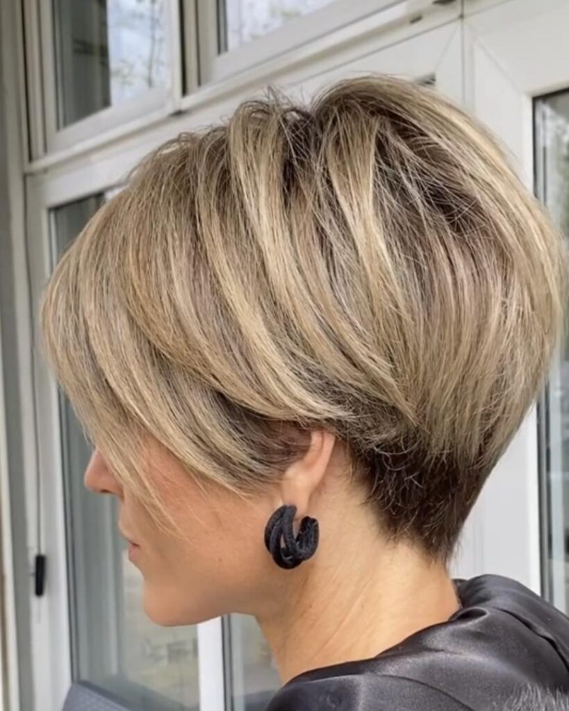 The layers are expertly stacked, creating a soft, sculpted shape that tapers toward the nape.
