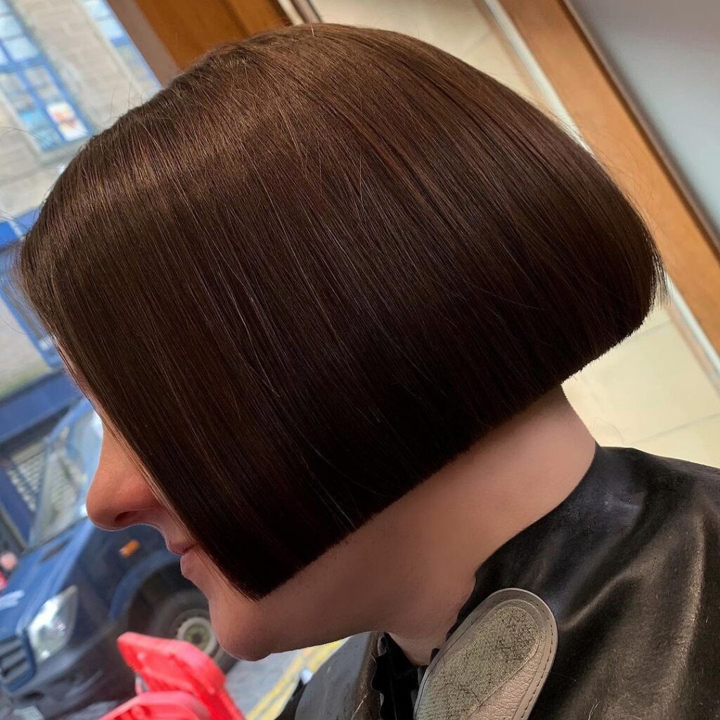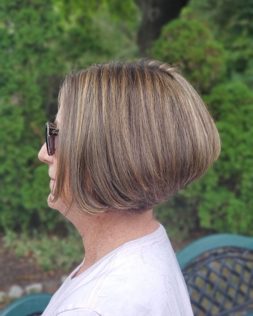 This stacked bob offers a smooth and sleek profile, perfect for those who prefer a tidy, refined look.