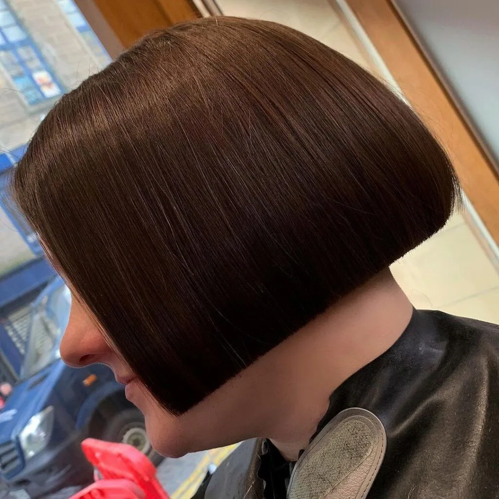 This stacked bob stands out with its ultra-smooth finish and precise, sharply angled cut. The back is subtly stacked, providing a slight lift that enhances the clean silhouette.