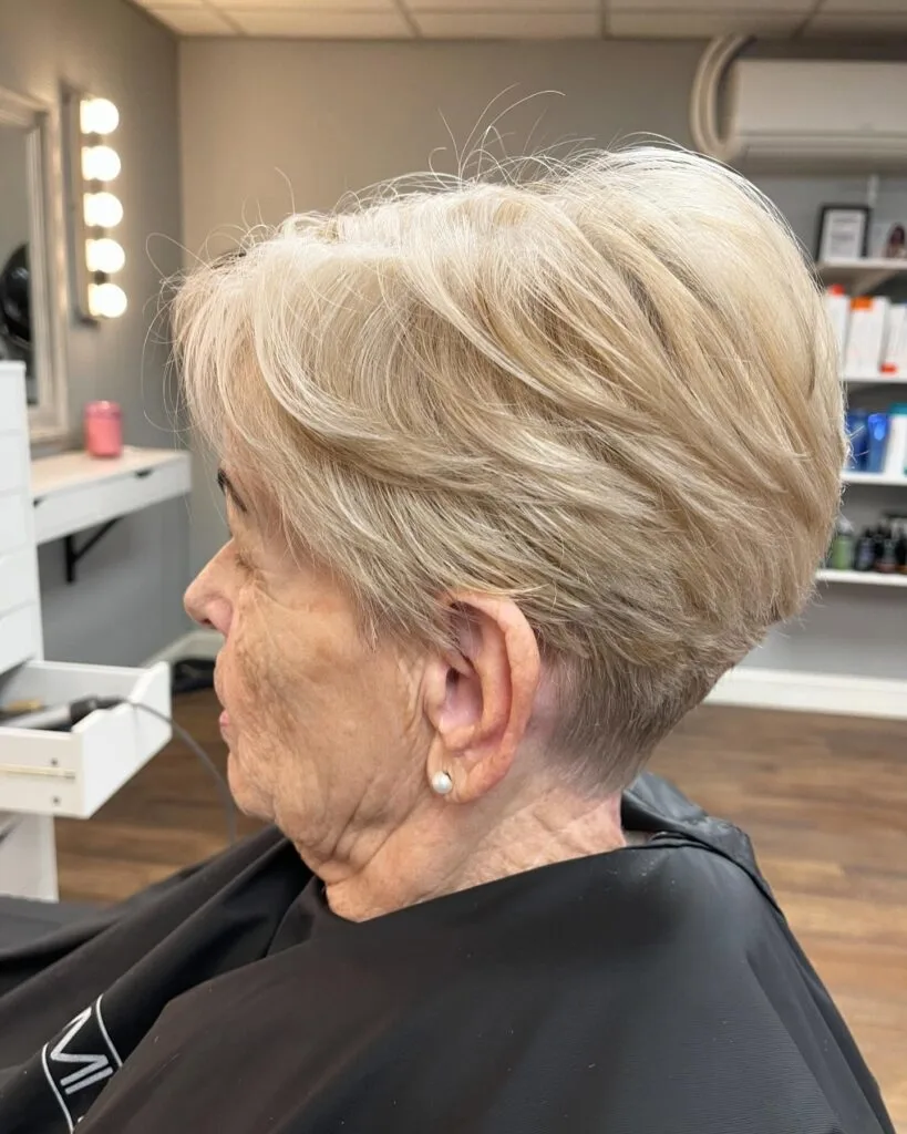 The light blonde color enhances the airy texture and adds a touch of brightness. Ideal for fine or thinning hair, this low-maintenance cut offers an elegant, timeless look that’s both flattering and easy to manage.