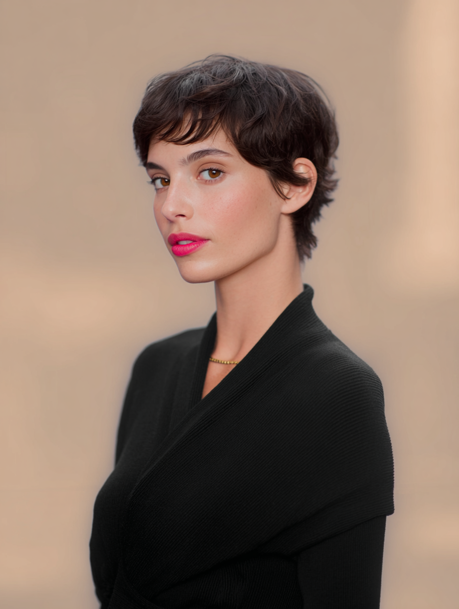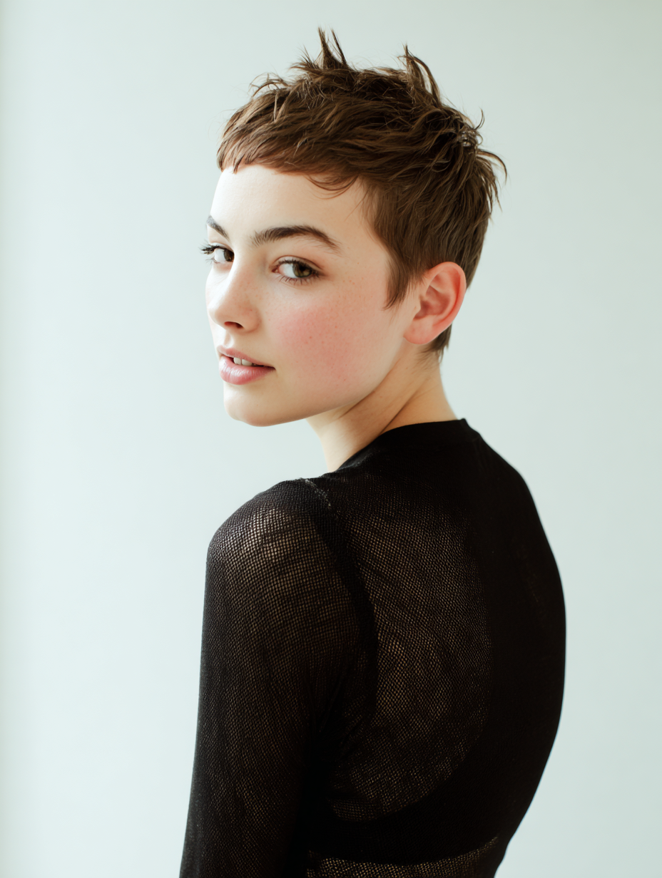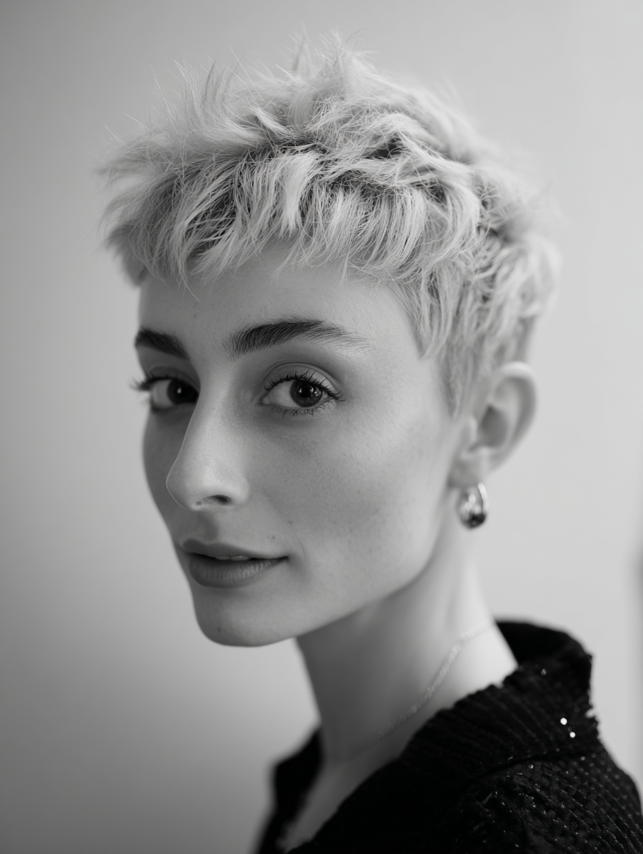 Short on the sides and back with a longer, piece-y top, the choppy pixie uses deliberate disconnection between sections to build texture and depth throughout the cut. The crown ends are cut unevenly so pieces fall and separate naturally rather than lying flat. A small amount of wax pressed through dry hair pulls the pieces apart and gives the style a sharp, expressive character. It suits straight and fine hair well, and the choppy finish makes grow-out easier to manage since slight changes blend into the existing texture.