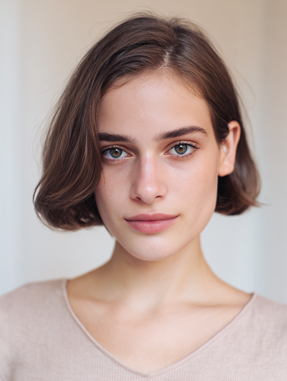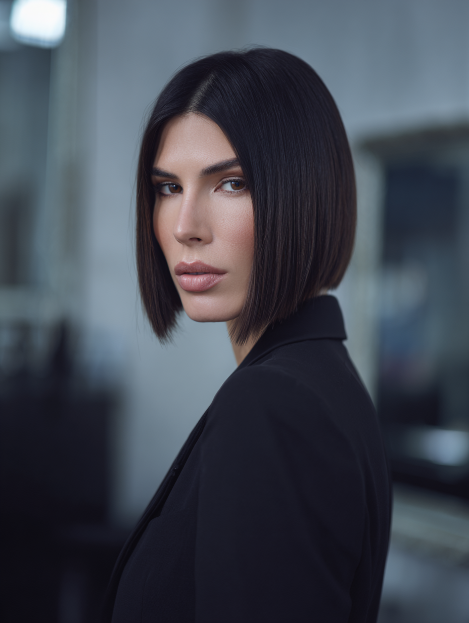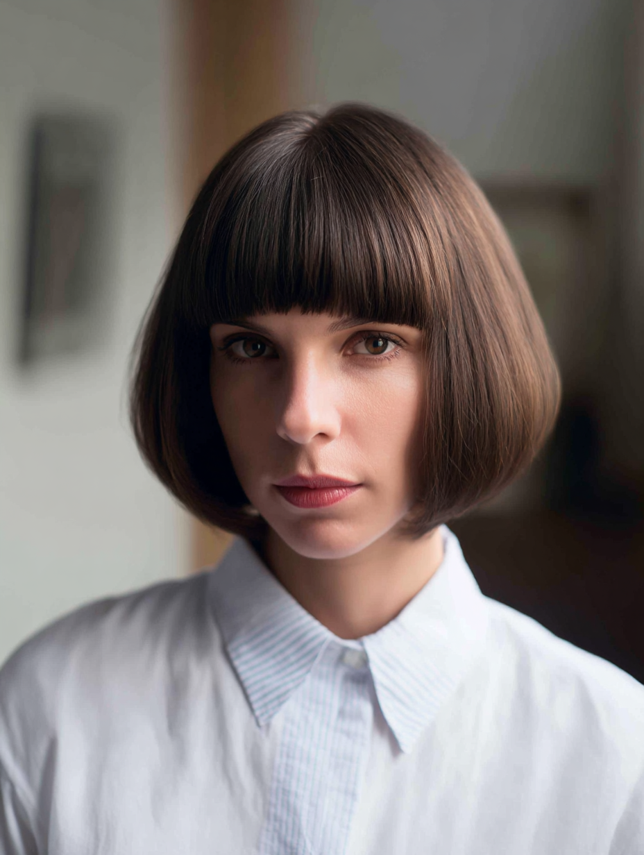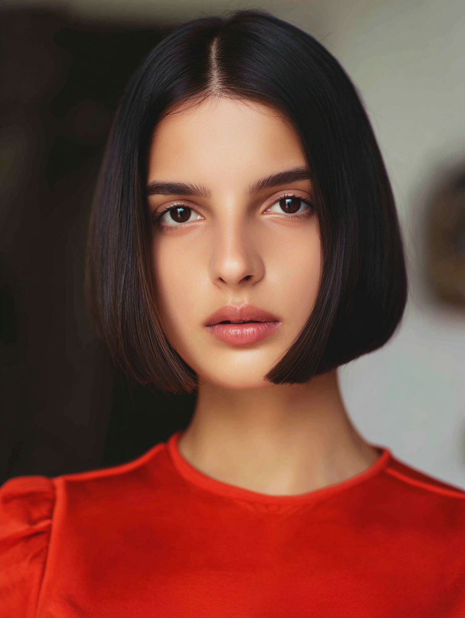 Cut straight across at jaw level with no graduation or layering, the blunt bob delivers a clean, graphic line that reads as both bold and polished. All the weight concentrates at the bottom, creating a dense, full silhouette that suits fine and medium hair particularly well. It frames the face evenly on both sides and draws attention directly to the cheekbones and jaw. A quick blow-dry with a round brush and a small amount of smoothing serum achieves the mirror-like finish this cut is known for.