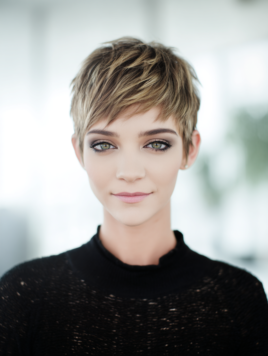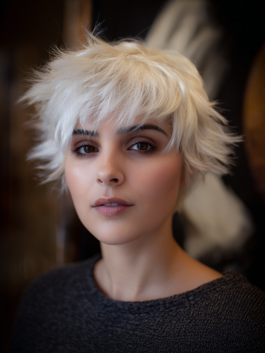 Longer pieces at the front part in the center and sweep softly to each side, creating a gentle, face-framing fringe on an otherwise closely cut pixie. The fringe adds softness around the forehead and temples without adding length to the back or sides, so the contrast between the open front and closely trimmed perimeter gives the cut a distinctive, balanced shape. It suits oval and heart-shaped faces particularly well. A light cream or wax keeps the fringe pieces separated and sitting naturally rather than flat against the forehead.