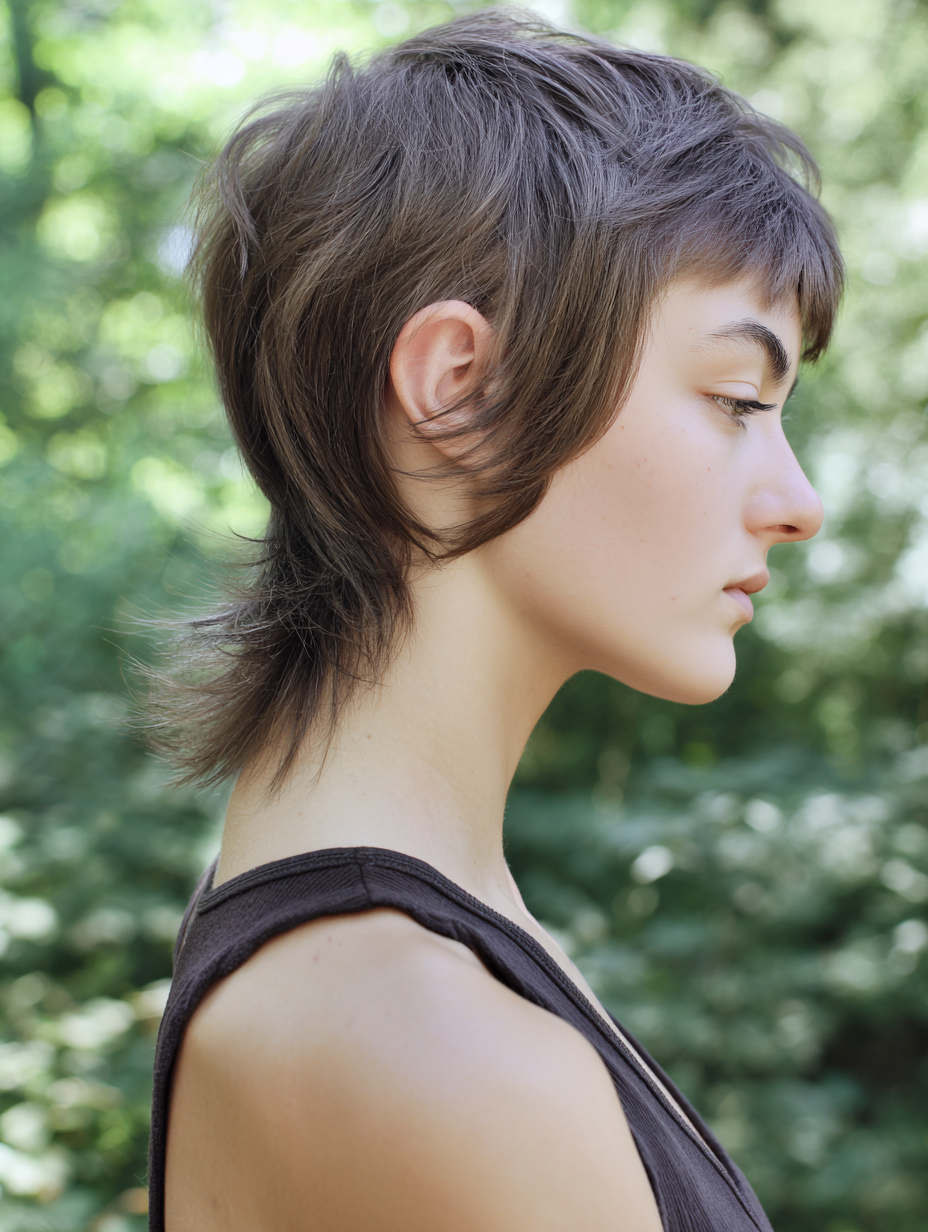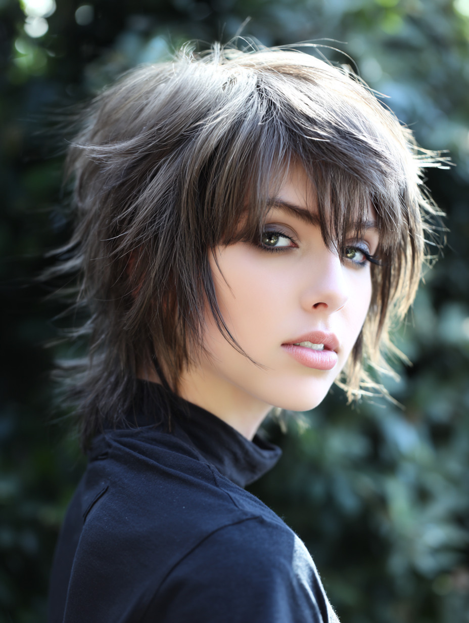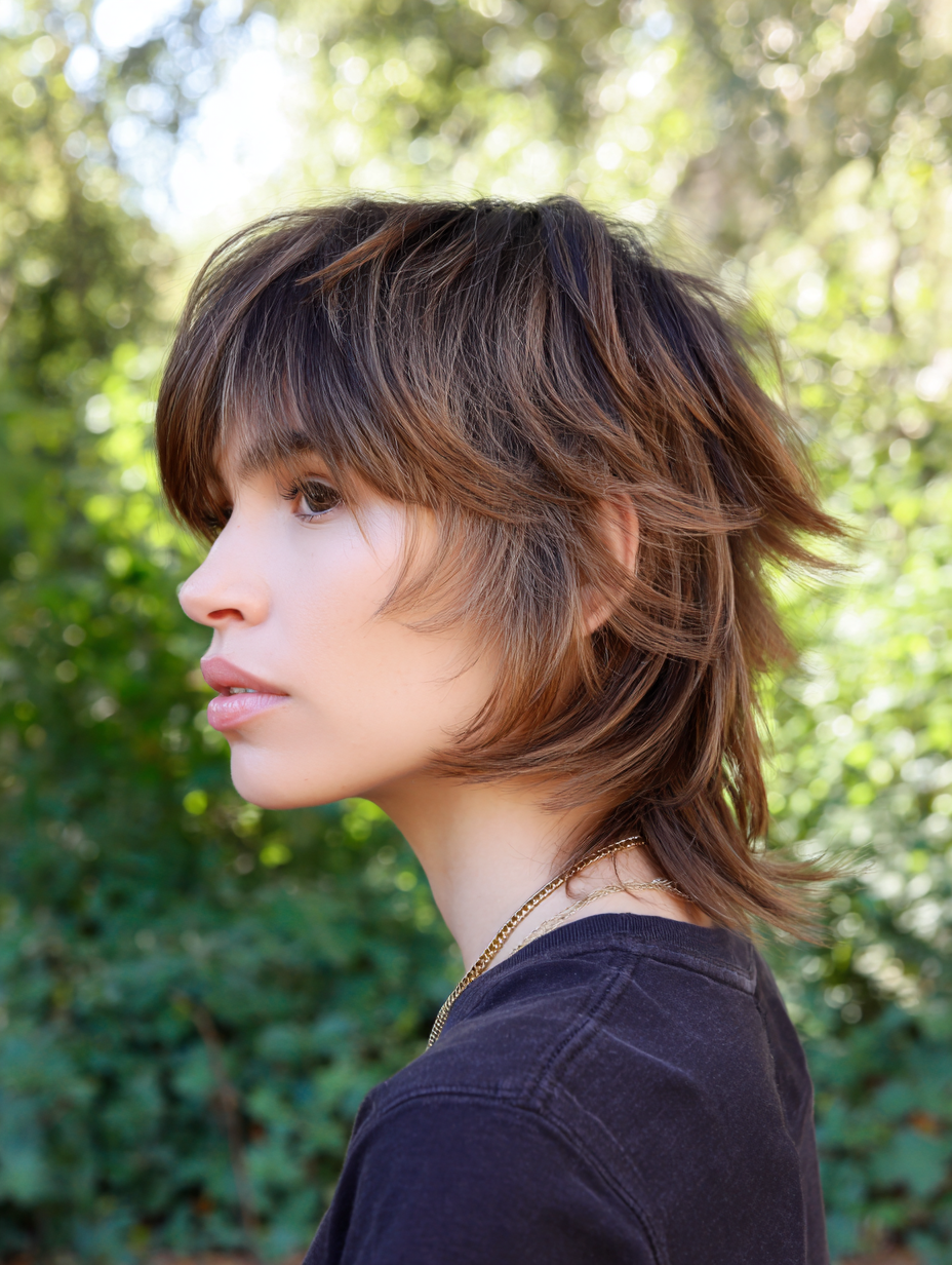 Applied to a chin-skimming length, the wolf cut brings heavy crown layering, face-framing curtain pieces, and a shaggy finish to a genuinely short silhouette. Volume builds at the top from the internal layering, and the front sections fall forward around the cheeks and jaw. The overall shape is full and slightly wild, with a lived-in quality that looks deliberate rather than messy. Wavy and textured hair responds best, though straight hair achieves similar dimension with a quick scrunch of texturizing spray.
