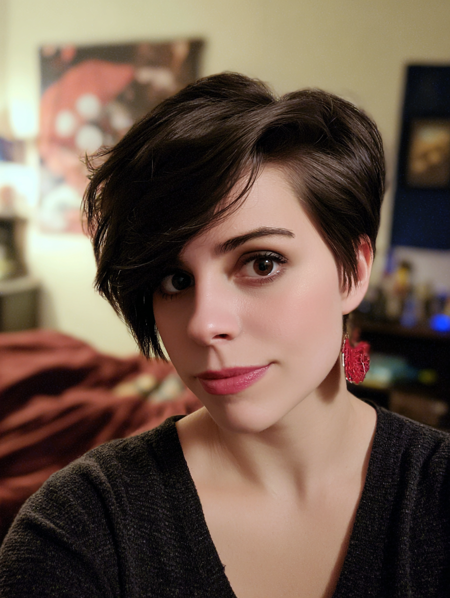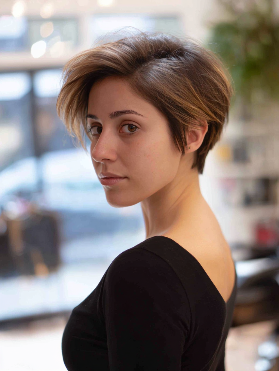 A deep side part sweeps the top section of the pixie across the forehead to one side, framing the face in a softer way than a centered style does. The shorter sections beneath stay trimmed and neat, and the contrast creates a dynamic shape that suits most face proportions. The sweep adds a gentle, feminine quality to the cut without adding length or changing the fundamental structure. A light hold product on damp hair keeps the swept section in place through the day without making it look stiff or overcomplicated.