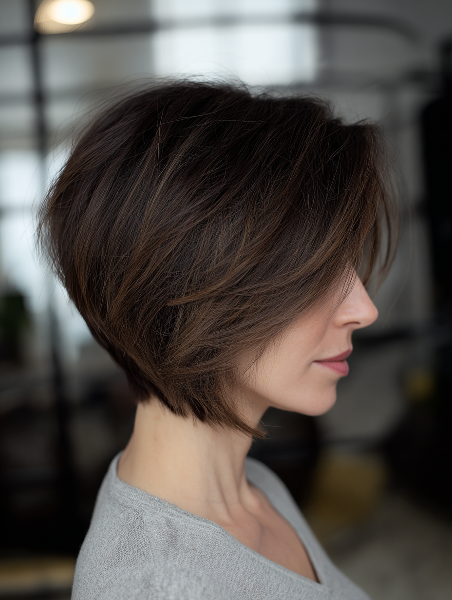 Shorter in the back with visible layering that builds roundness at the crown, the stacked bob creates lift and fullness without relying on product or heat. The stacking means the back sits close and rounded while the front pieces angle forward near the chin, framing the jaw with a flattering diagonal line. The shape holds well between cuts because volume is built into the structure itself. Curly and wavy hair benefits most since natural texture amplifies the rounded silhouette and adds visible dimension through the back section.