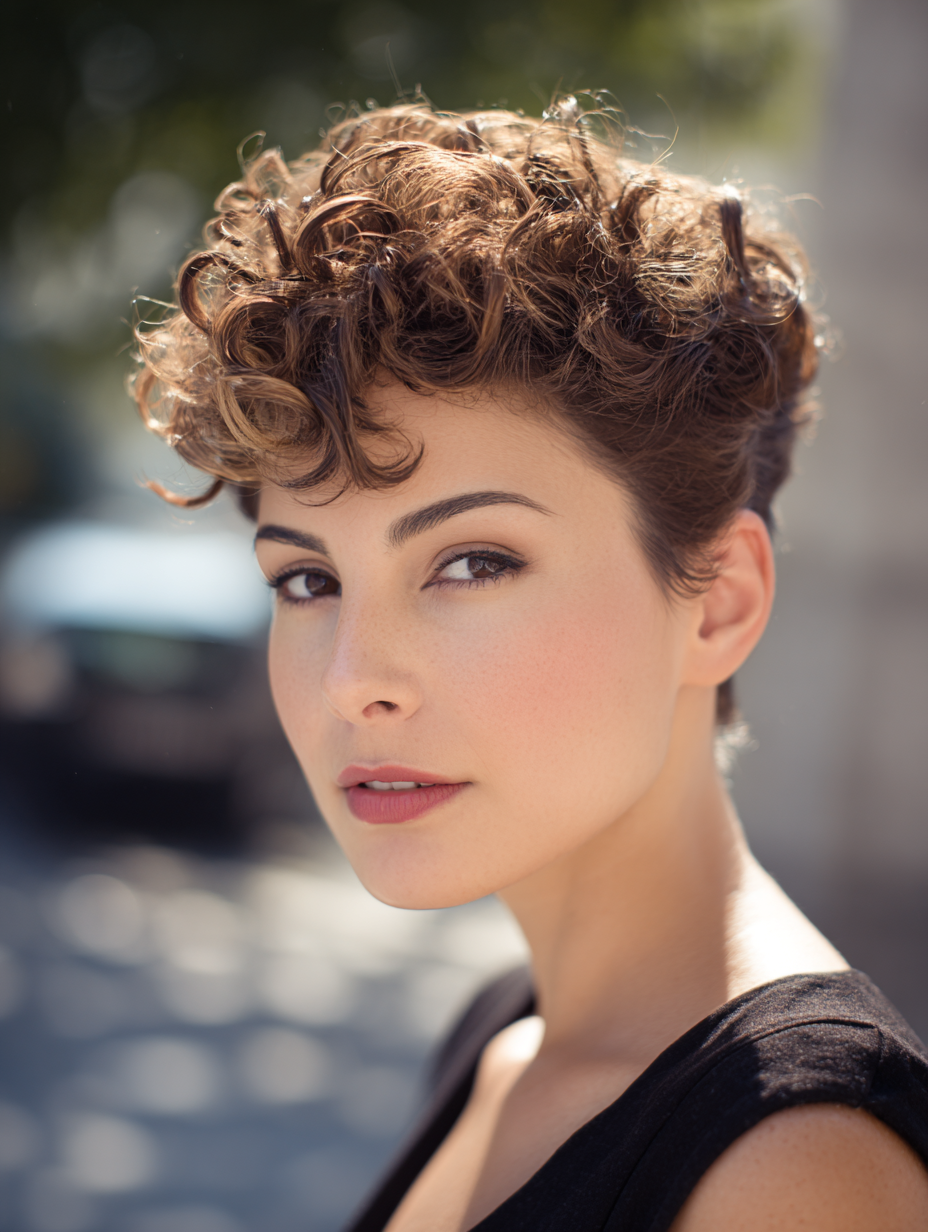 Natural curl patterns thrive in a short pixie because the coils create their own volume and shape without much product or heat. The sides and back stay closely trimmed while the top is left slightly longer so curls spring upward and form a full, rounded shape at the crown. Tighter curl types benefit most since shrinkage contributes to the compact, dense result the cut is built around. Applying a light curl cream to damp hair and diffusing brings out the pattern cleanly without flattening or disrupting the natural shape.