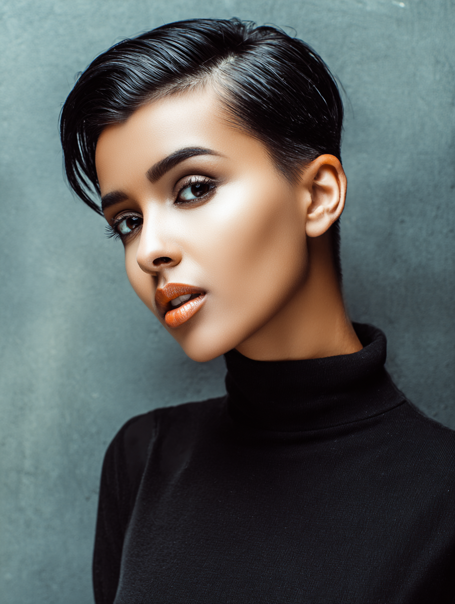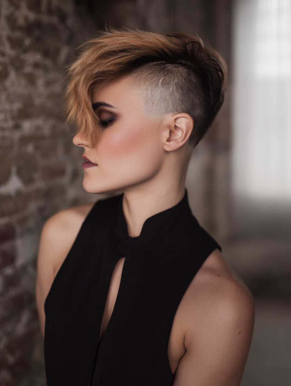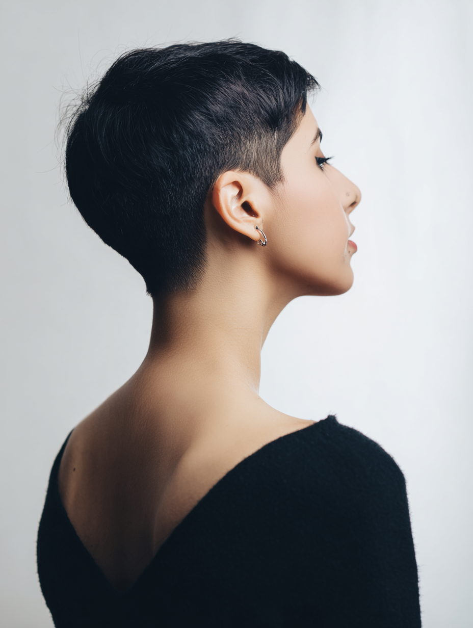 The undercut pixie keeps the sides and lower back very short, sometimes closely buzzed, while leaving more length on top to create a strong contrast between the two sections. The top layers can be textured and tousled or kept smooth depending on preference, and the shaved sections add a precise edge that makes the silhouette feel structured and intentional. It suits thick and dense hair particularly well since the undercut removes bulk and makes the top feel lighter. The style is striking and straightforward to maintain between visits.