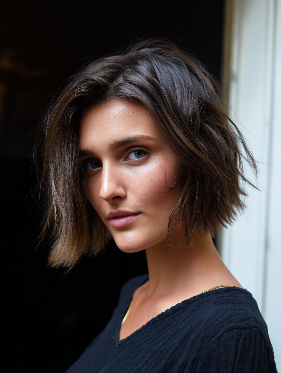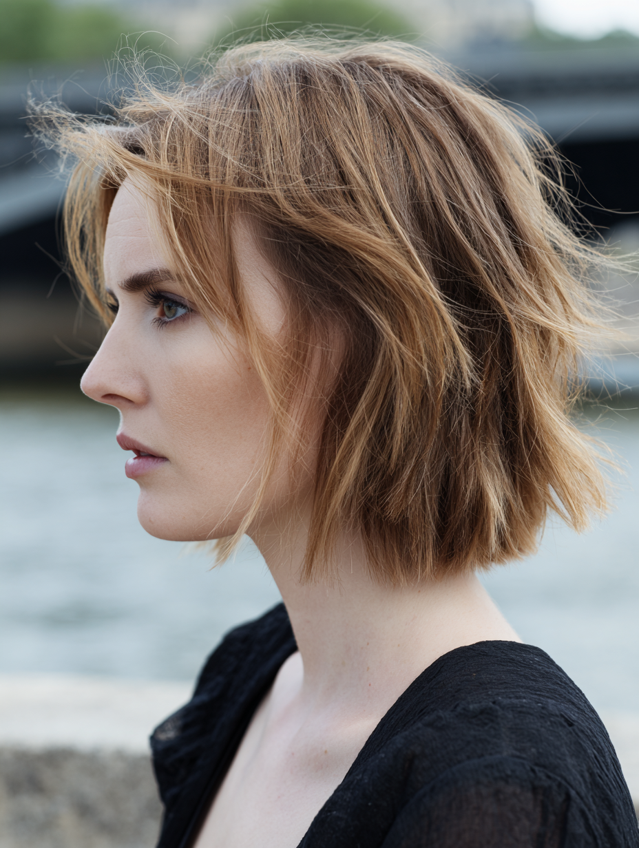 A razor is used through the ends of this jaw-length bob rather than scissors, creating a softer, irregular finish that gives the hair a naturally feathered quality. The ends have a broken, wispy texture that moves easily and never looks too heavy or precise. It suits wavy and fine hair especially well since the razor enhances existing texture without adding weight. Very little product is needed each day, and the style stays fresh between trims because the soft ends grow out gradually rather than leaving a blunt, obvious line.