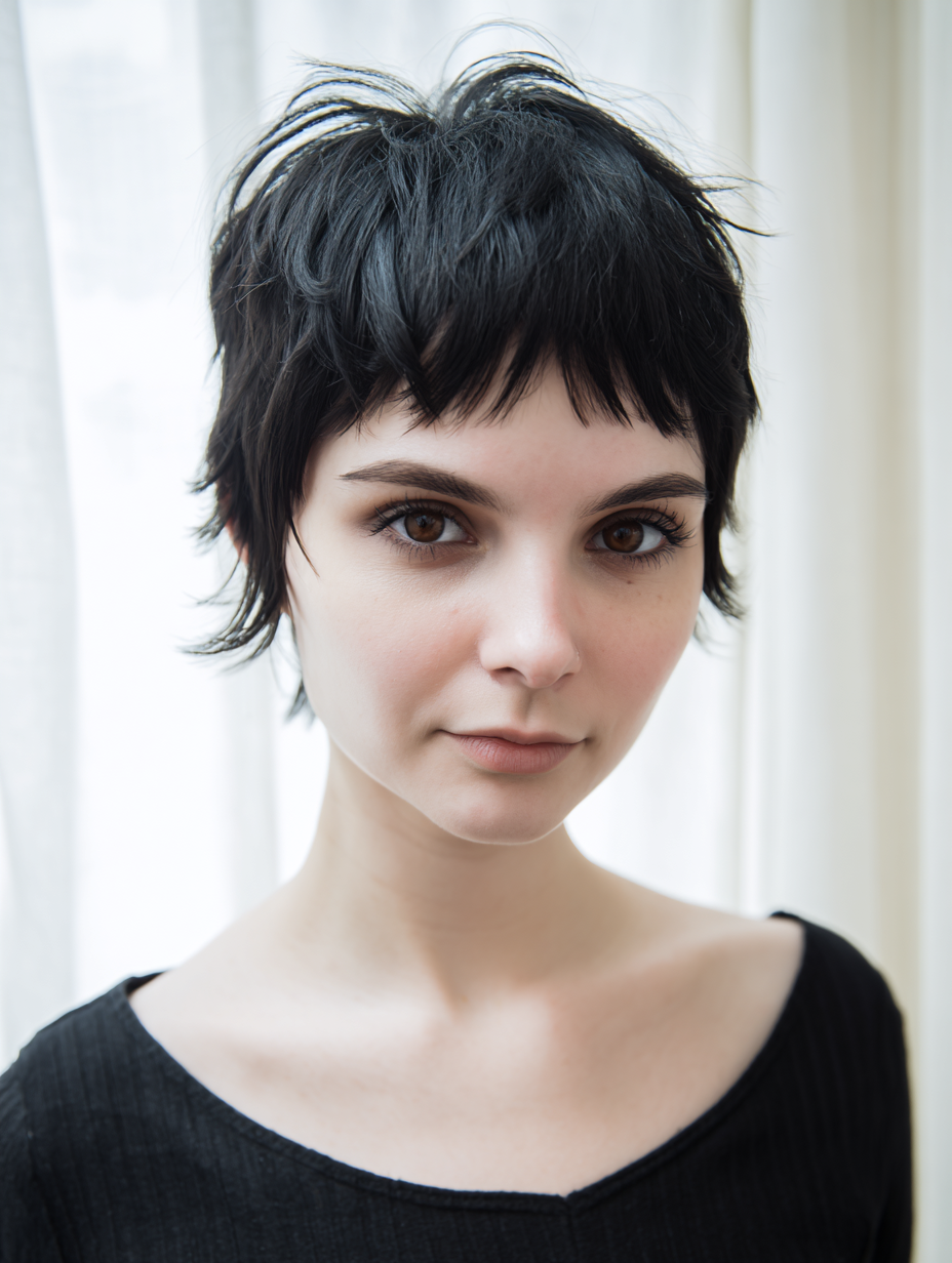 Disconnected layers give this pixie a raw, deliberate texture that sets it apart from smoother, polished versions of the cut. The top is left longer with choppy, uneven ends that move in different directions, while the back and sides stay short and structured. The contrast between sections adds depth and keeps the style looking intentional as it grows out. A small amount of matte paste through dry hair defines the pieces without adding shine or weight, making it a good option for people who prefer a relaxed morning routine.