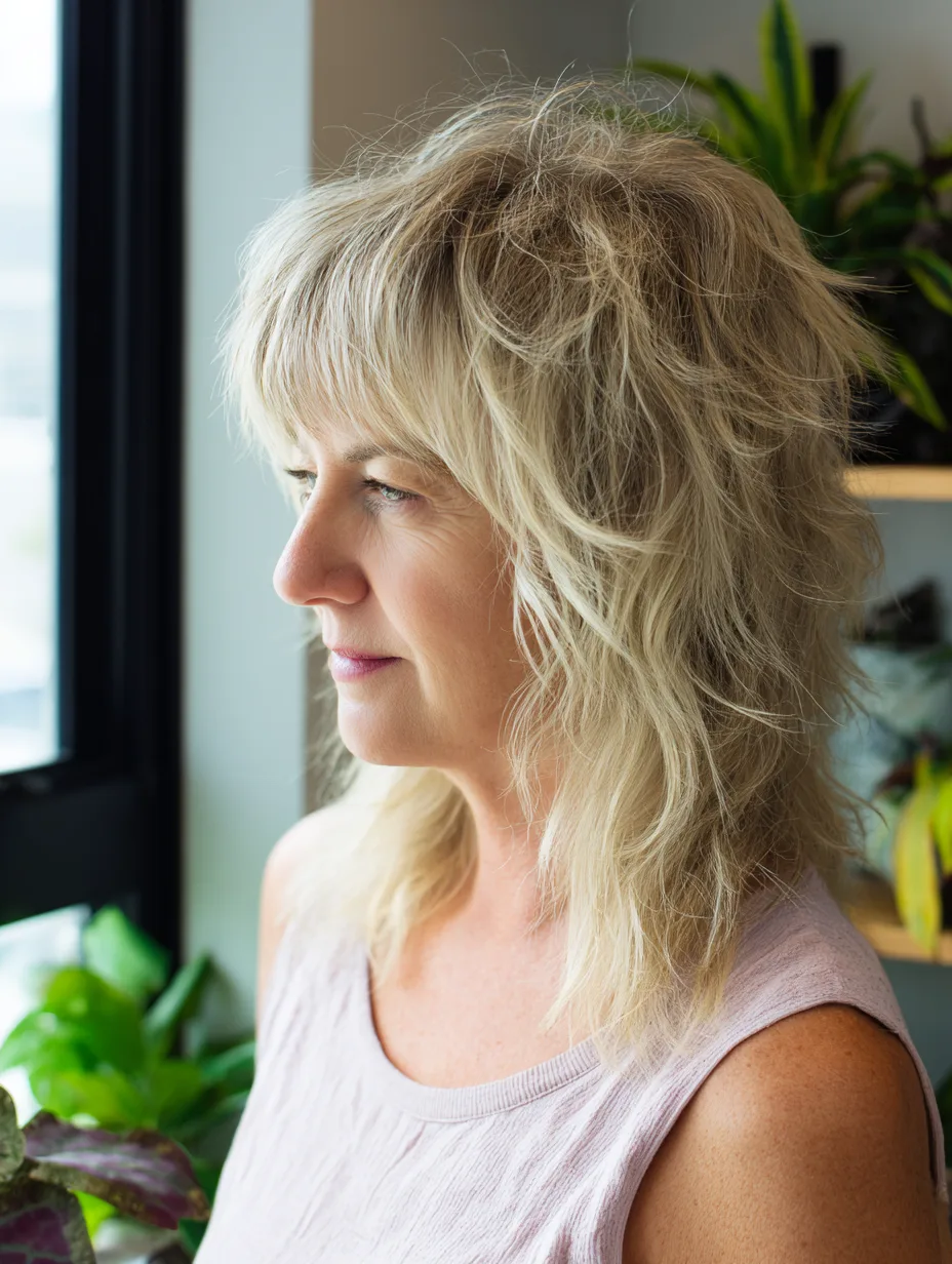 A shoulder-length shag brings texture and movement through carefully placed layers. The shape encourages natural volume, especially when you let the hair air-dry.