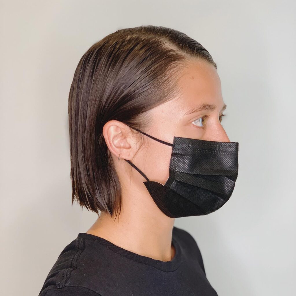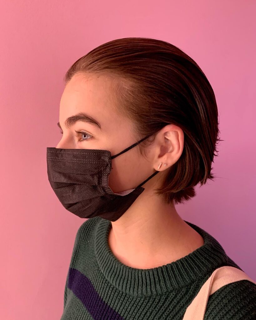 It hugs the scalp smoothly, while the ends subtly flip outward, adding a playful twist to the otherwise sharp silhouette.
