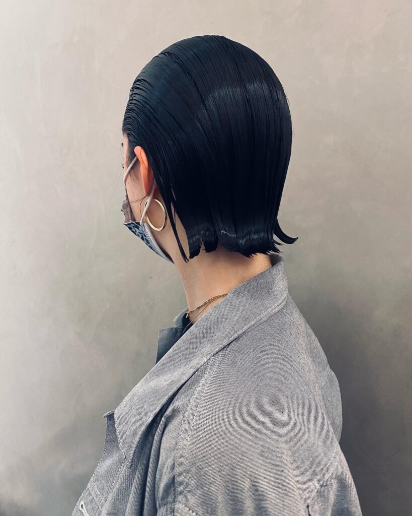This glossy slicked-back bob is bold, sculpted, and runway-ready. The hair is saturated with product for an ultra-sleek, wet-look finish, combed straight back with visible precision.