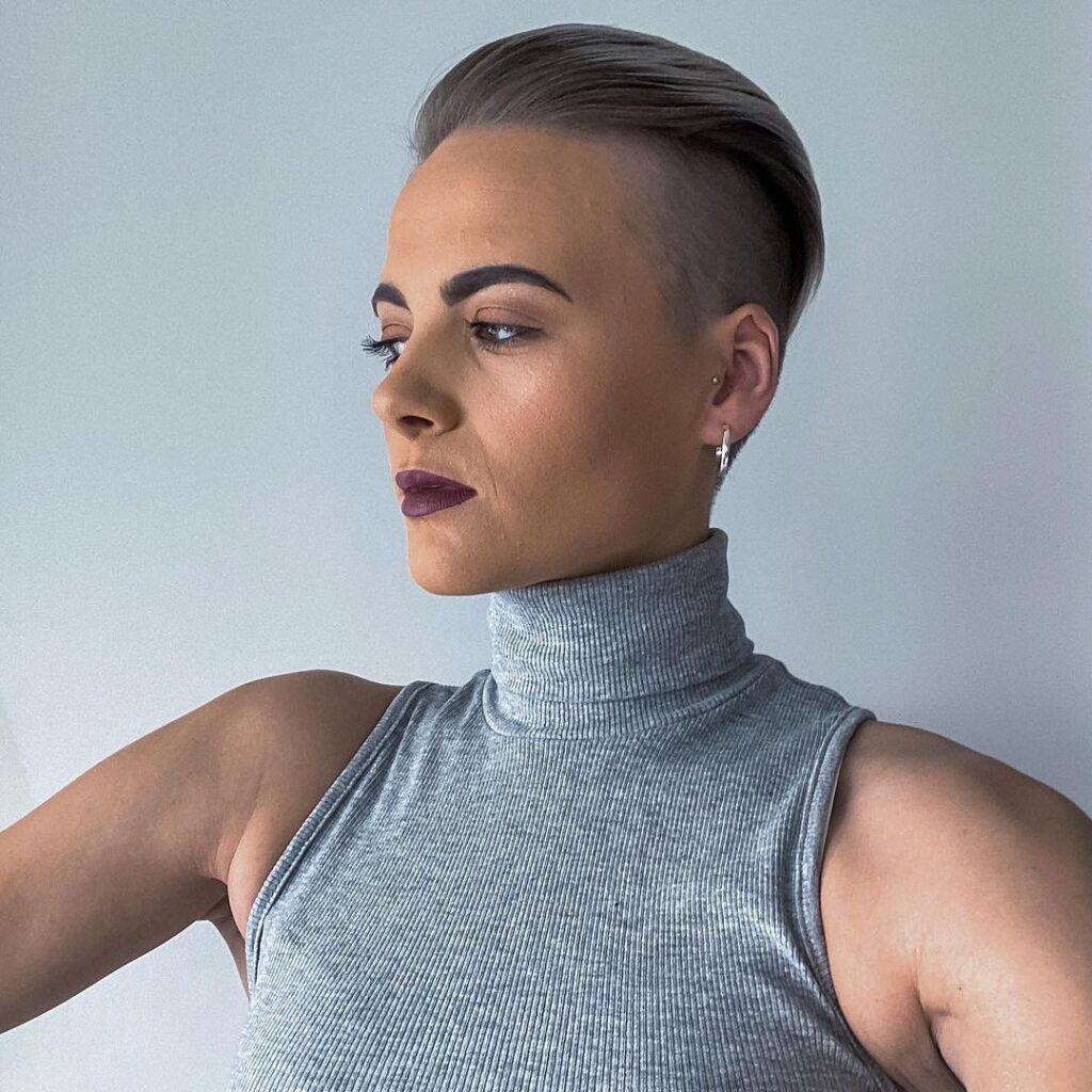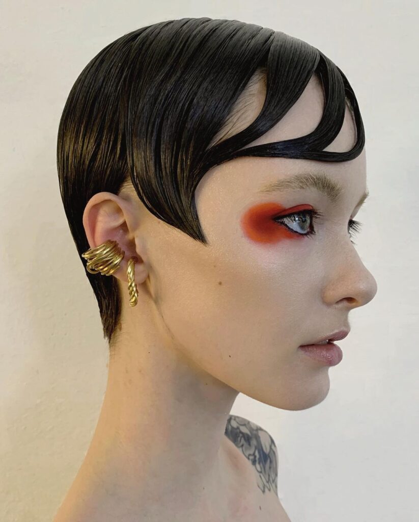 This hairstyle is perfect for those who want a fashion-forward, short haircut with refined detail and a pop of personality.
