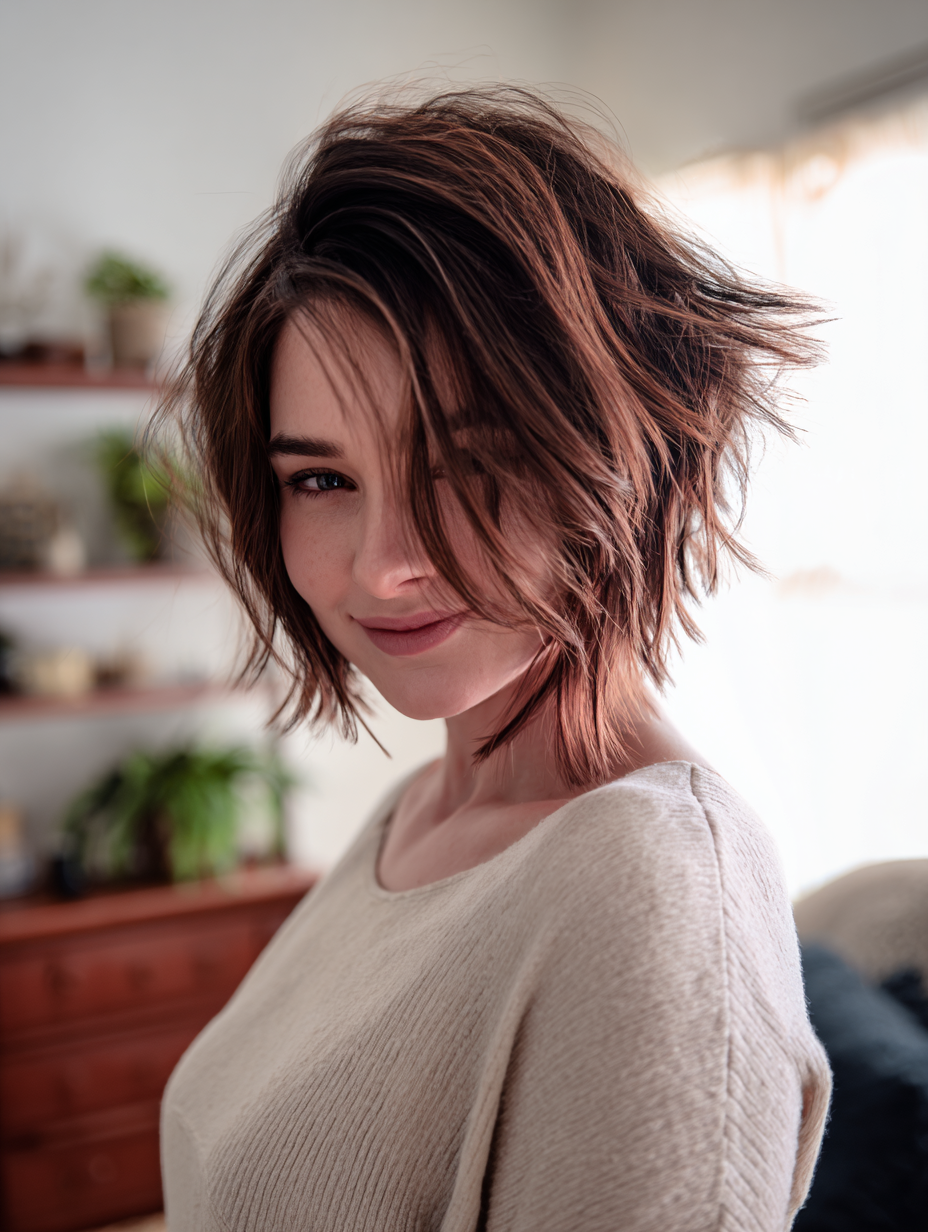 A choppy stacked bob uses uneven layers to add noticeable texture, which works well for fine hair that needs extra lift.