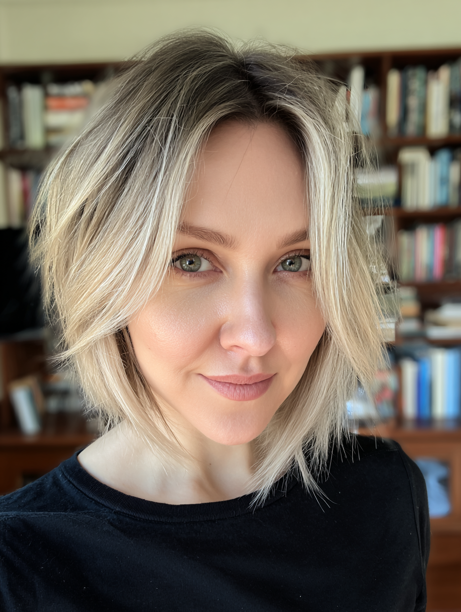 A textured stacked bob adds intentional movement through light choppy layers. These layers create separation that makes fine hair appear fuller without extra weight.