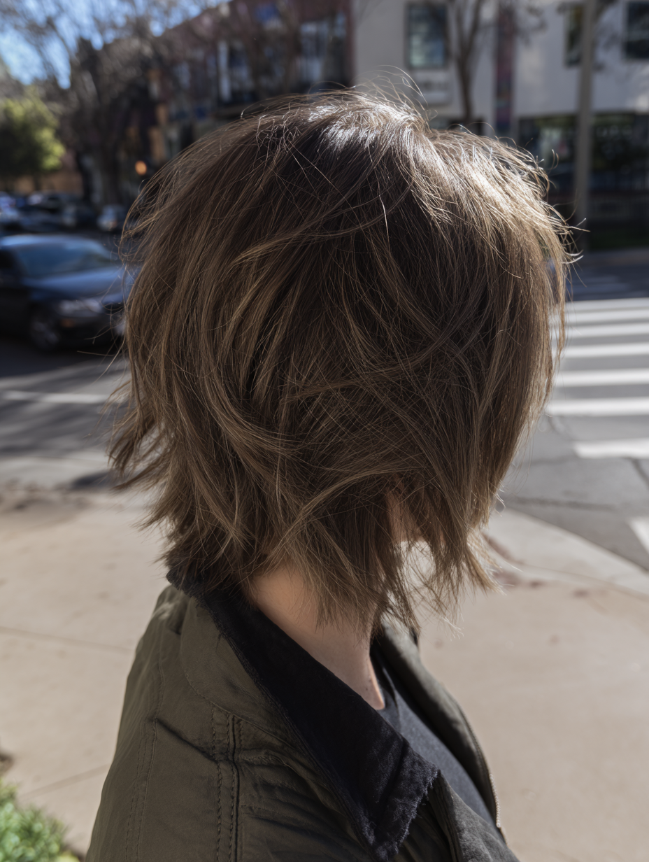 The choppy pieces create separation and movement without feeling heavy. The stacked back supports the shape and keeps everything controlled. You can wear it messy or smooth, depending on your mood.