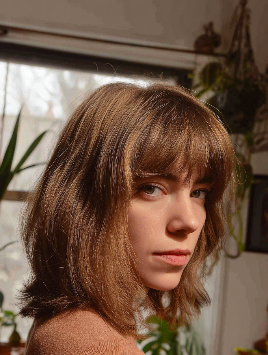 You can style the fringe straight or slightly curved for a smoother finish. This haircut stays manageable because the layers guide the shape without requiring heavy styling each morning.