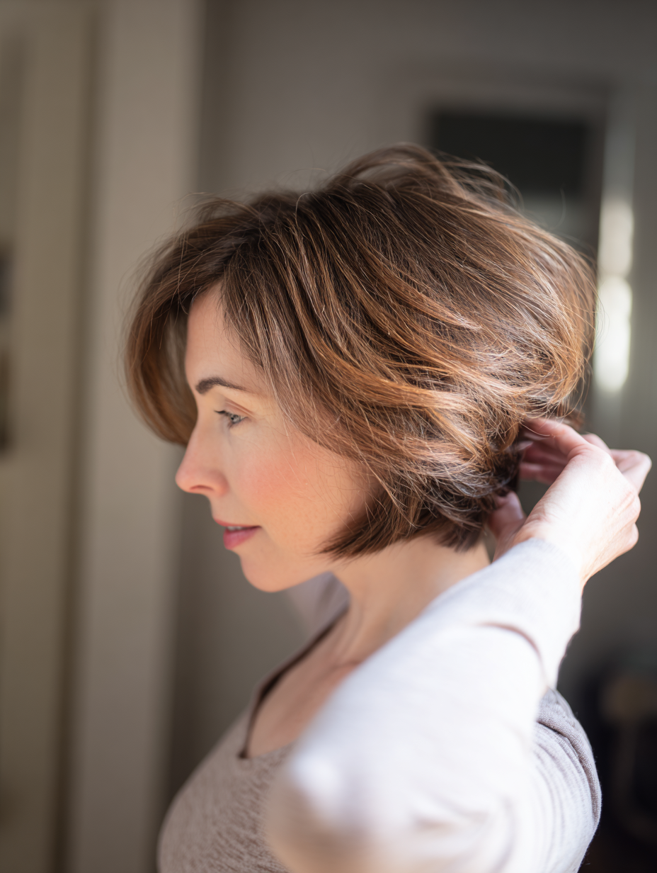 A stacked bob with subtle waves adds gentle movement that gives fine hair a slightly fuller appearance. The waves work well because they lift the surface and create texture.